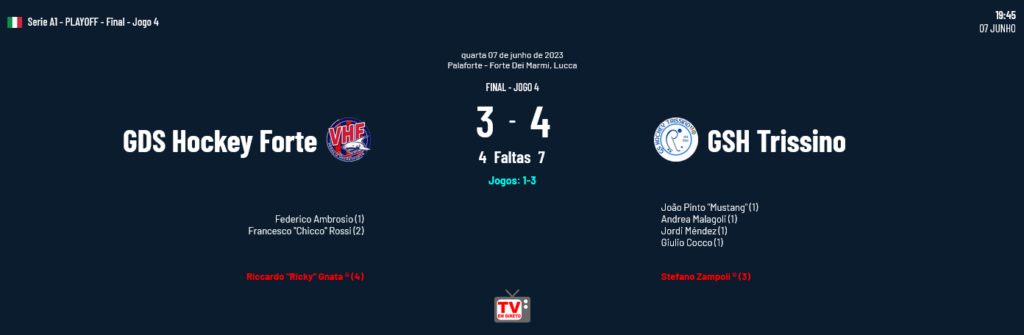 O Hockey Trissino venceu o 4º jogo da Final do Playoff da Serie A1 italiana para consumar a vitória na maior competição transalpina de hóquei em patins, após jogo muito equilibrado com o Hockey Forte.