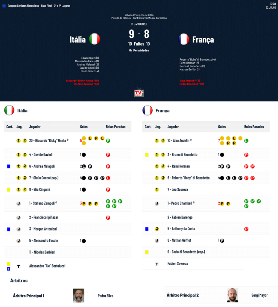 Para a medalha de Bronze a Itália não resolveu um problema sempre muito delicado chamado França e esteve a perder, primeiro por 2-0 com golos de “Roby” Di Benedetto (o primeiro fabuloso) para depois Elia Cinquini reduzir já no primeiro minuto da 2ª parte.