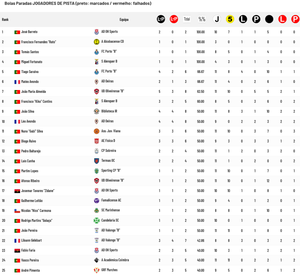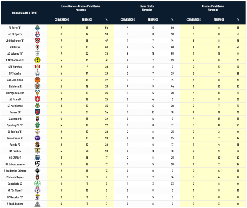 FC Porto “B” e OH Sports são, de entre todas as equipas que participam no Campeonato Nacional da 2ª Divisão, as únicas que têm aproveitamento igual ou superior a 50% na transformação de Bolas Paradas.