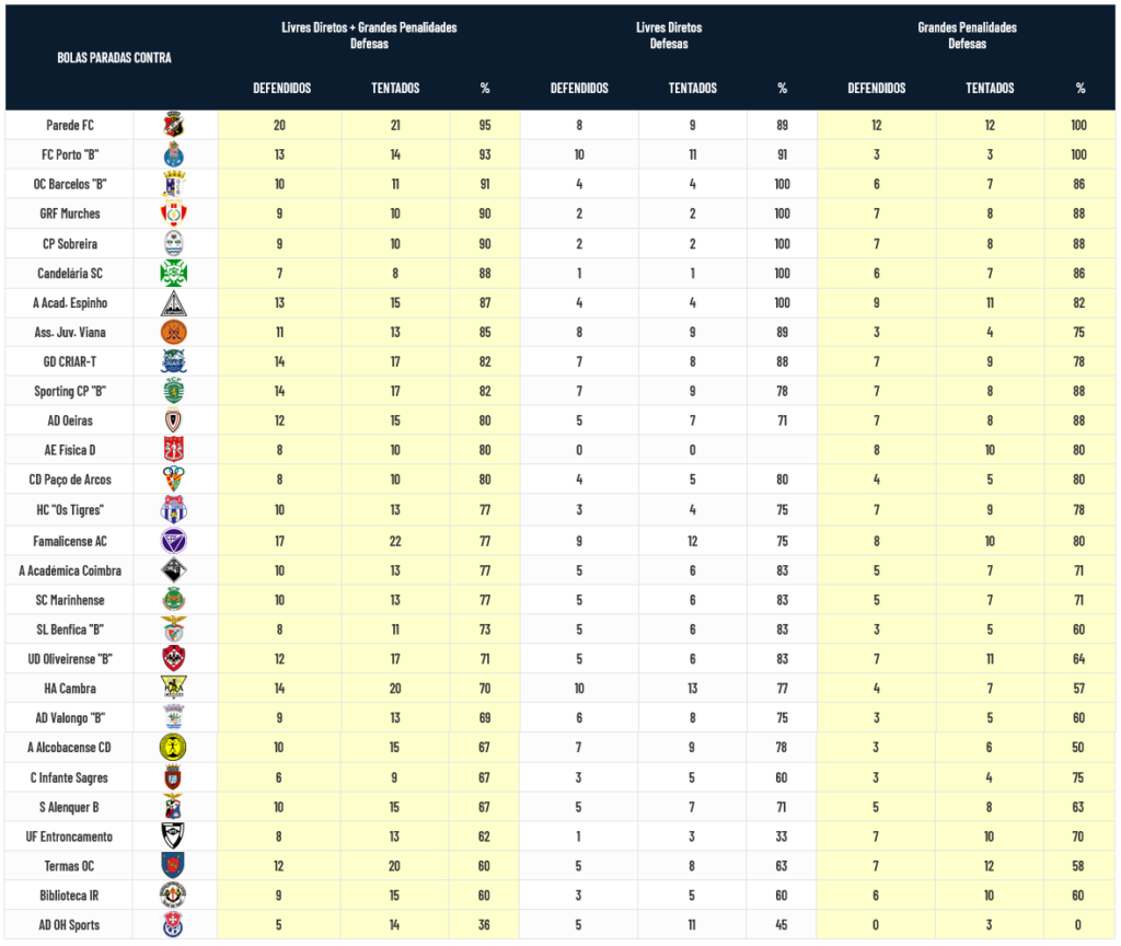 Parede, Porto “B”, Barcelos B, Murches e Sobreira, de entre todas as equipas que participam no Campeonato Nacional da 2ª Divisão, têm os guarda-redes que defendem 90% ou mais das Bolas Paradas a que são sujeitos.