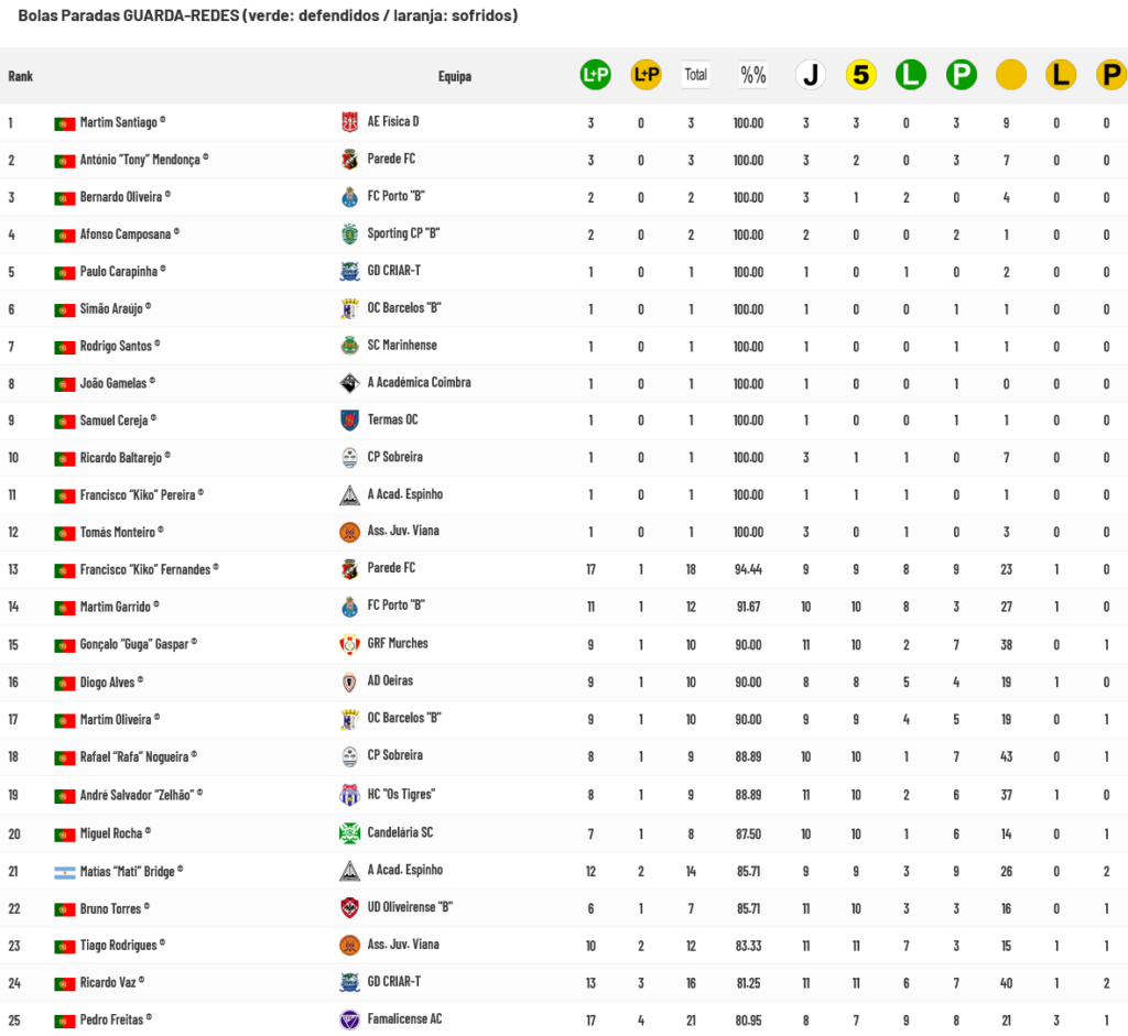 São 25 os guarda-redes que conseguem defender mais de 80% das Bolas Paradas a que são sujeitos no Campeonato Nacional da 2ª Divisão: