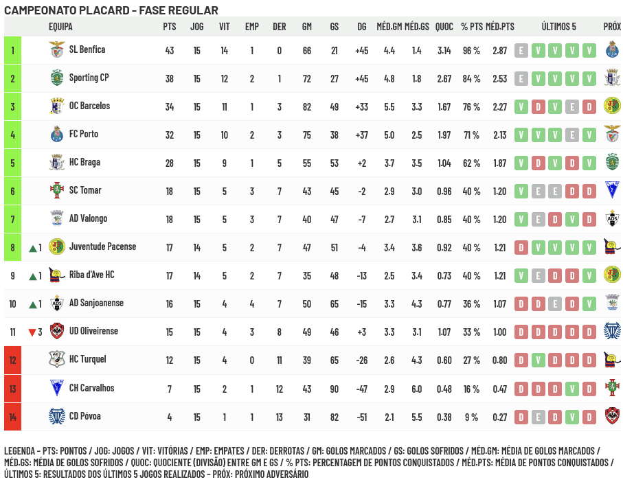 Barcelos e Oliveirense perderam os seus jogos da 15ª Jornada pelo mesmo resultado (4-5) mas com consequências muito diferentes: enquanto o Barcelos, com a derrota em Riba de Ave, fica mais longe dos primeiros classificados permitindo ao Riba d’Ave subir ao 9º lugar da tabela classificativa com o mesmo número de pontos do 8º classificado (Juventude Pacense) e continuar a sonhar com o apuramento para o Playoff, a Oliveirense perdeu no seu próprio pavilhão com a Sanjoanense caindo, assim, para o 11º lugar da tabela da Classificação Geral, a três pontos de um lugar de despromoção (Turquel em 12º lugar) permitindo à Sanjoanense a ultrapassagem com a subida ao 10º lugar a 1 ponto dos lugares de Playoff… Benfica (5-1 ao Valongo), Sporting (8-1 ao Desp. Póvoa) e Porto (9-1 ao Turquel) aproveitaram da melhor maneira o fator casa e somaram os 3 pontos enquanto o Braga surpreendeu o Sp. Tomar arrebatando uma vitória no Pavilhão Municipal Patrícia Sampaio em Tomar, mantendo um folgado 5º lugar da tabela classificativa. Finalmente, a Juventude Pacense recebeu e venceu o Carvalhos e continua a sonhar com a participação no Playoff, já que subiu ao 8º lugar (último que permite a ida ao Playoff) empatado com o Riba d’Ave e com um ponto de avanço sobre a Sanjoanense e dois sobre a Oliveirense. Vejamos os resultados da jornada 15:
