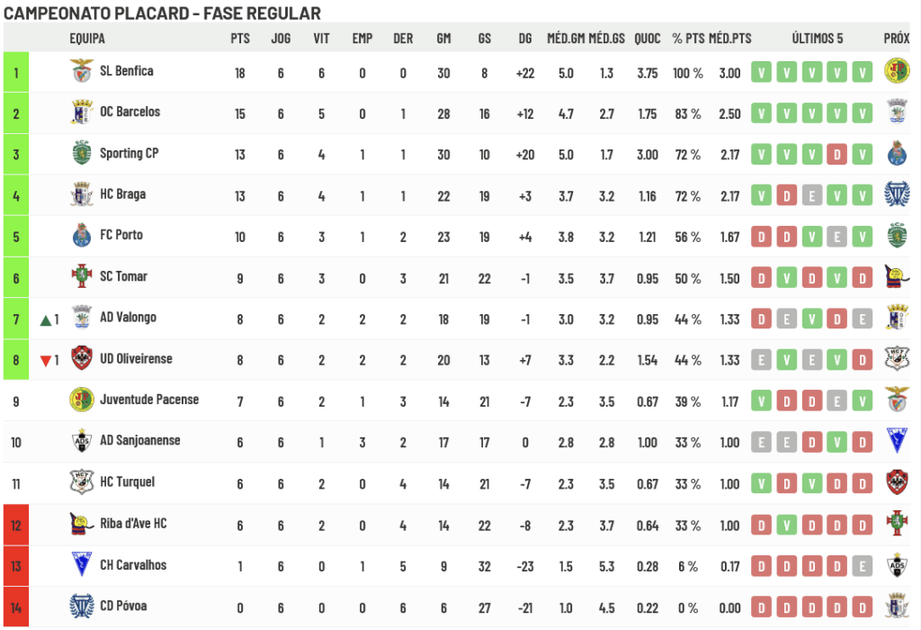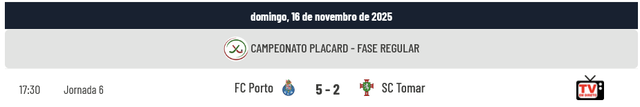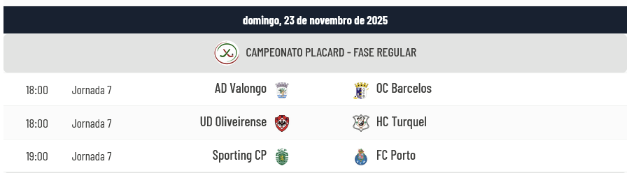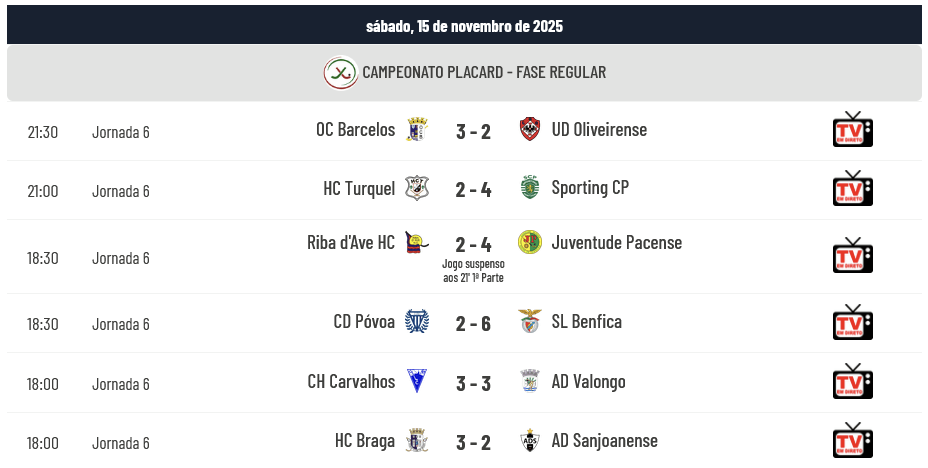 Barcelos, Sporting, Benfica, Braga e Porto foram os vencedores dos jogos da 6ª jornada do Campeonato Placard com Carvalhos e Valongo a empatarem e Riba d’Ave e Pacense a não conseguirem finalizar o seu jogo, suspenso por falta de condições de segurança, conforme argumentou a equipa de arbitragem.
