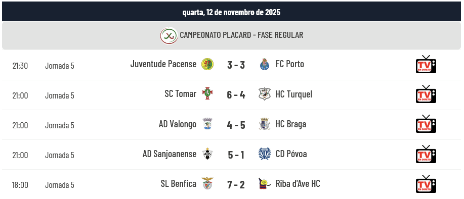 Jogos muito intensos foram disputados na quarta-feira, dia e que a 5ª Jornada do Campeonato Placard foi terminada, com realce para o empate (3-3) do Porto que marcou a 16 segundos do fim do jogo em Paços de Ferreira para roubar um empate precioso ao Pacense . O Benfica venceu por 7-2 em dia de aniversário de Zé Miranda (3 golos) mas teve forte oposição do Riba d’Ave. O Braga foi a Valongo vencer por 5-4 após estar a perder por 2-0 ao intervalo. A Sanjoanense venceu por 5-1 o Póvoa e o Sp. Tomar venceu por 6-4 o Turquel num derby sempre muito emocionante…
