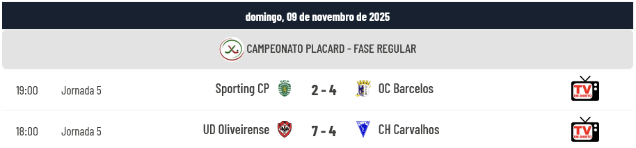 No domingo já se tinham realizado dois jogos com o realce a ir para a vitória do Barcelos em Lisboa na visita ao Pavilhão João Rocha (4-2 ao Sporting) e a vitória da Oliveirense sobre o Carvalhos por 7-4.