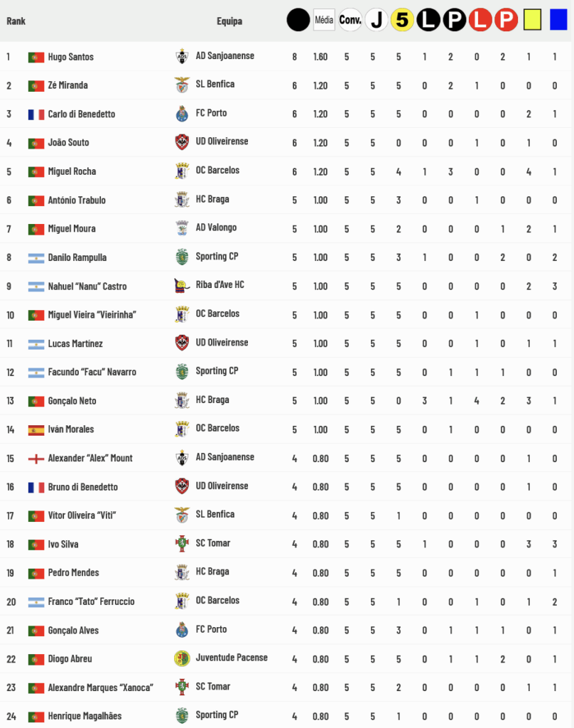 Hugo Santos é o goleador mais atarefado com 8 golos marcados, seguido de Zé Miranda, Carlo Di Benedetto, João Souto e Miguel Rocha, todos com 6 golos marcados: