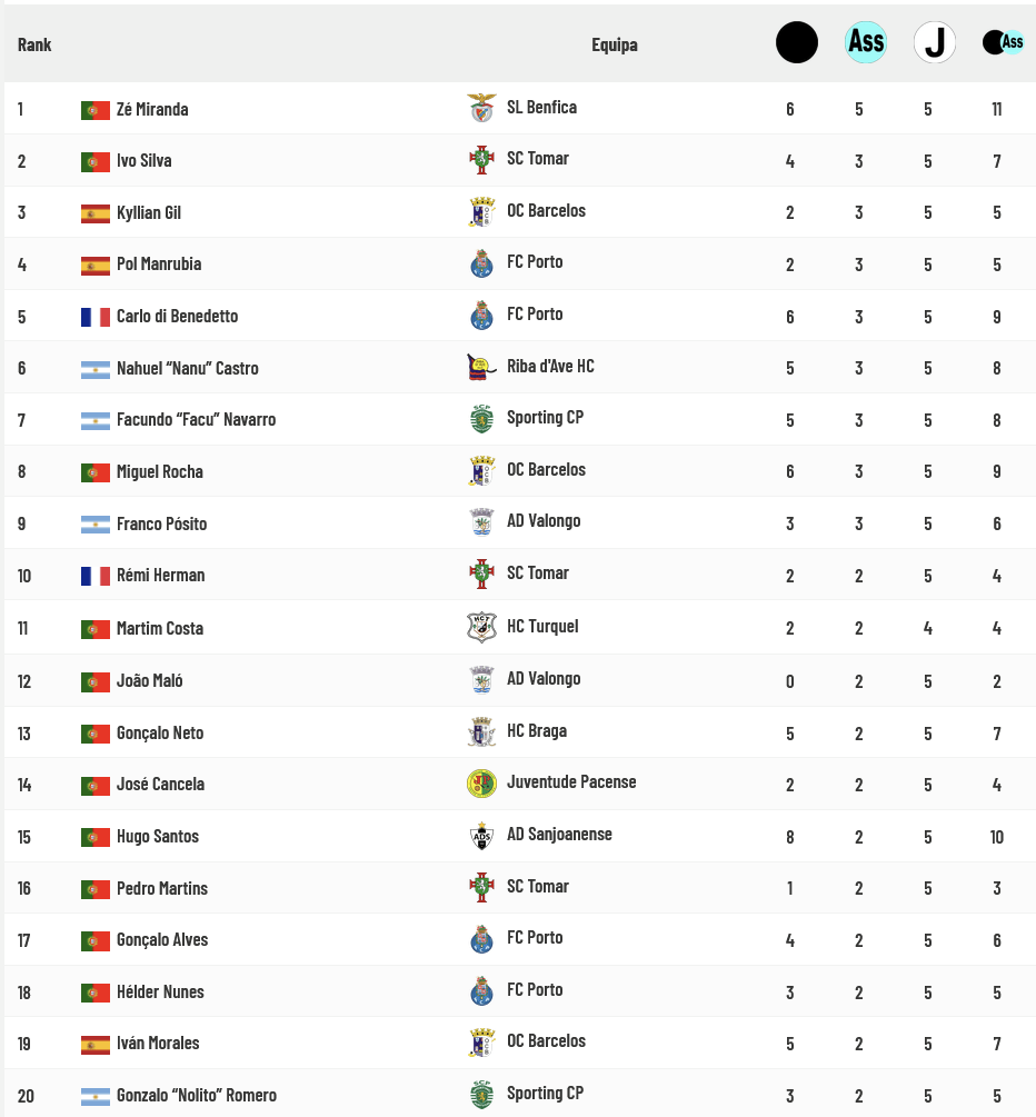 No que concerne às Assistências, Zé Miranda é o jogador que por mais vezes fez passes para golo e é também o que é mais vezes participa em golos (somatório de golos e assistências para golo).