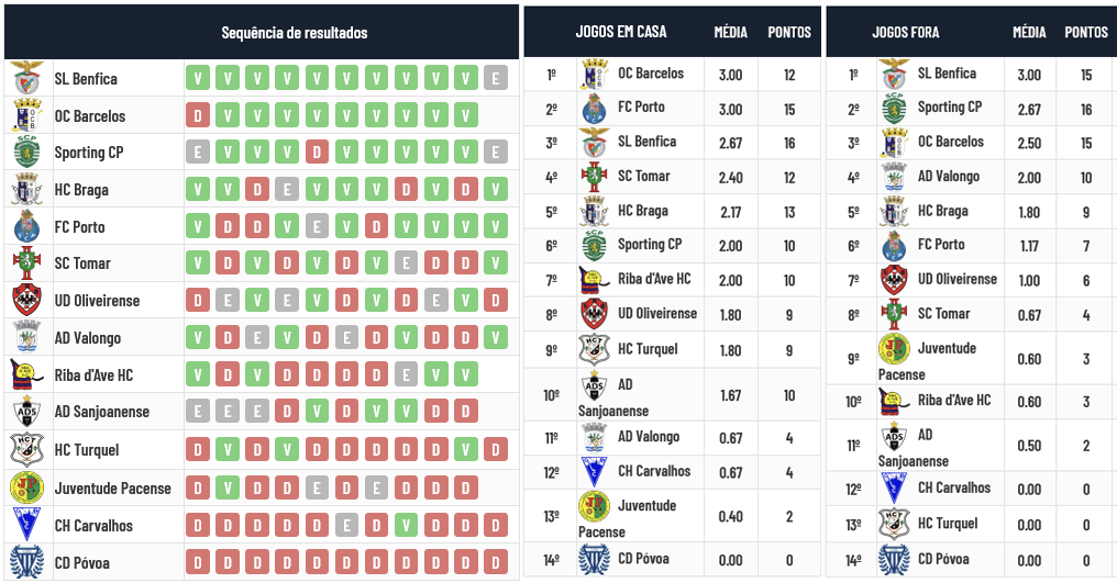 A melhor série de vitórias consecutivas pertence ainda ao Benfica enquanto o Desp. Póvoa é a que tem o maior número de derrotas consecutivas. Barcelos e Porto contam somente com vitórias nos jogos em casa enquanto só o Benfica tem o mesmo resultado fora de portas: