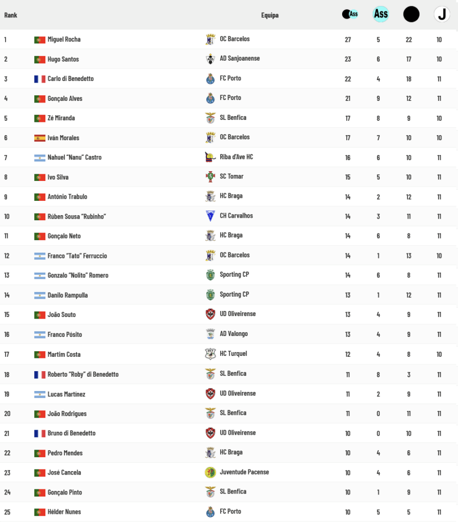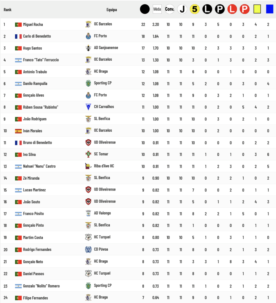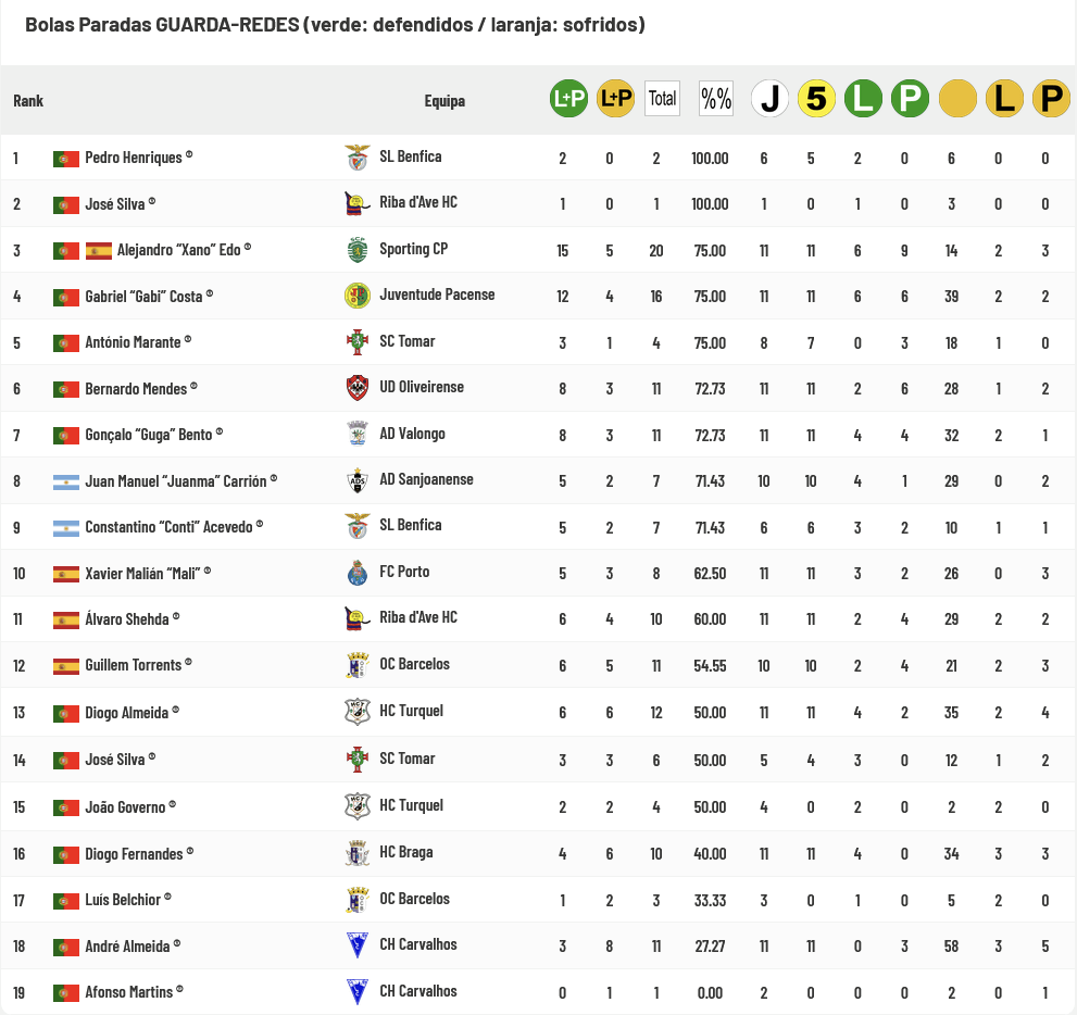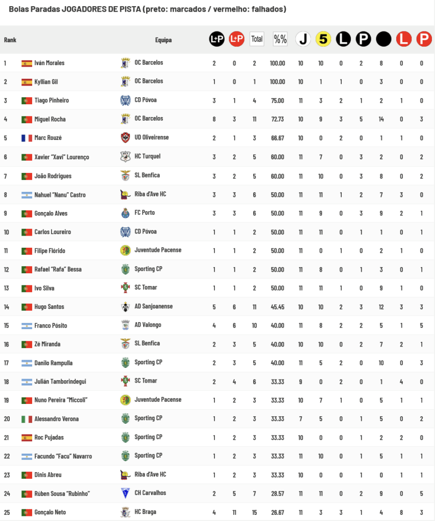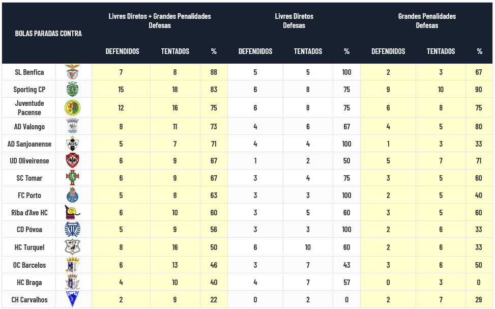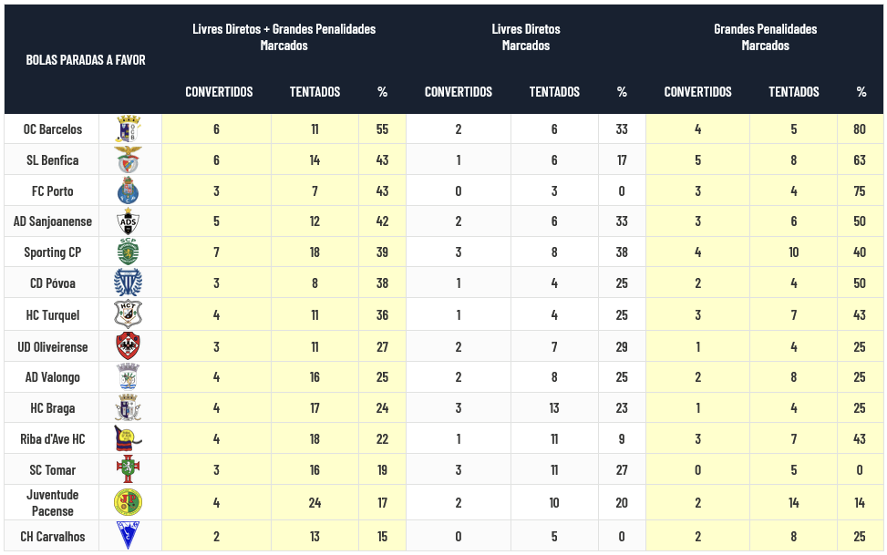 Os jogadores do Barcelos são agora os que melhor aproveitam as Bolas Paradas e únicos que ultrapassam os 50% de aproveitamento de transformações, com os de Benfica e Porto no encalço enquanto os Guarda-Redes de Benfica e Sporting são os únicos que ultrapassam os 80% de sucesso na defesa das Bolas Paradas: