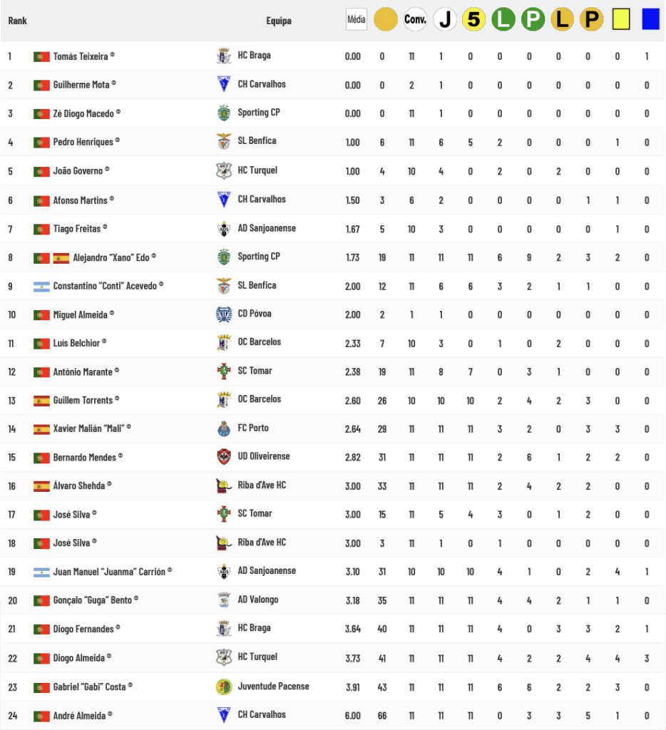 Há agora somente três guarda-redes que ainda não sofreram golos no Campeonato Placard (mas que realizaram somente 1 jogo ou parte dele) face aos 3 golos sofridos por Afonso Martins frente ao Barcelos e há 5 guarda-redes com médias de golos sofridos inferiores a 2 por cada jogo realizado: