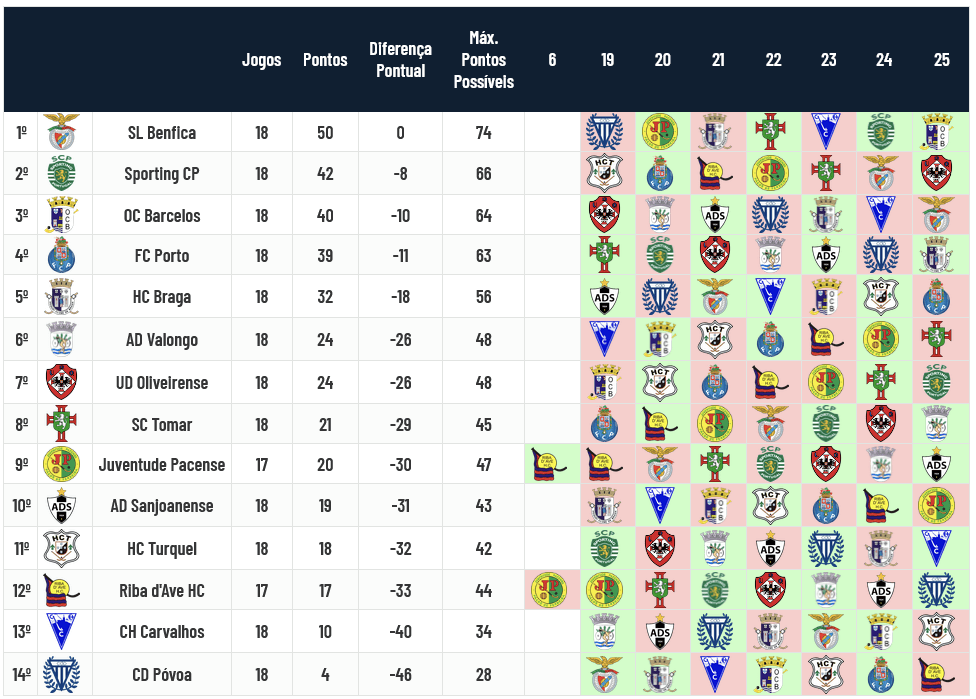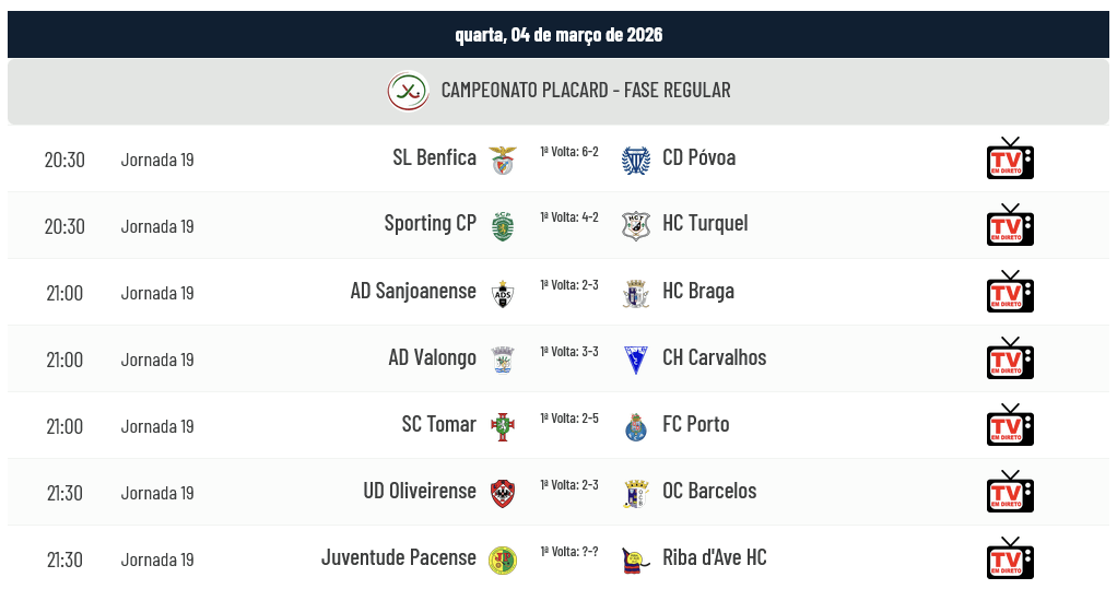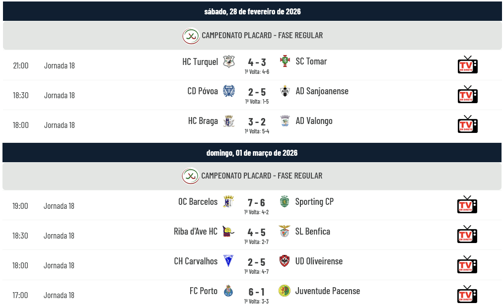 Terminou a jornada 18 do Campeonato Placard com alguns jogos super competitivos, como os resultados o demonstram: o Barcelos venceu o Sporting por 7-6 em jogo de loucos que teve no Power-Play um elemento definidor; o Benfica venceu em Riba d’Ave pela margem mínima depois de estar a perder por 3-1 e por 4-3; o Turquel venceu por 4-3 o Sp. Tomar; o Braga venceu o Valongo por 3-2; Sanjoanense e Oliveirense venceram respetivamente Desp. Póvoa e Carvalhos pelo mesmo resultado (5-2); e finalmente, o Porto venceu o Pacense por margem confortável…