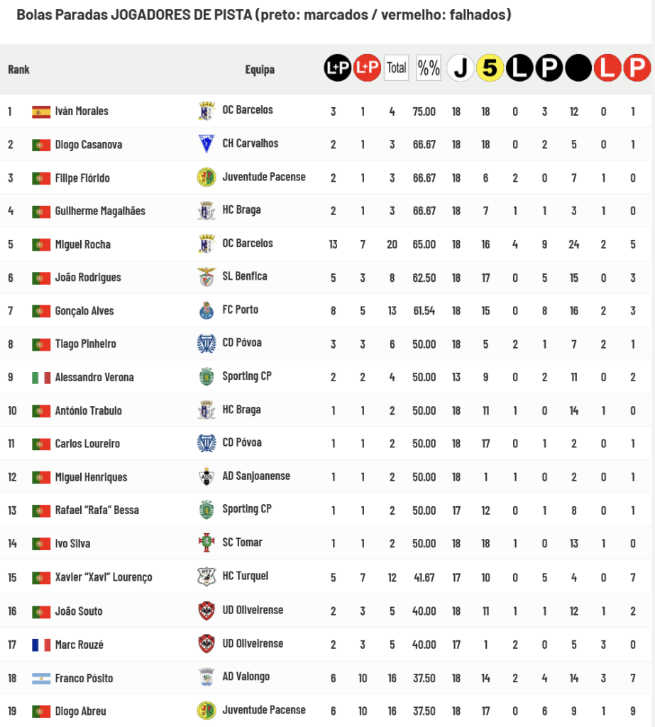 José Silva (em 2 ocasiões) e Tiago Freitas (numa somente) são os únicos guarda-redes que ainda não foram batidos nas tentativas de transformação de Grandes Penalidades ou Livres Diretos. Pedro Henriques defende mais de 80% das Bolas Paradas a que é sujeito e “Xano” Edo, Bernardo Mendes, “Guga” Bento, “Conti” Acevedo, “Juanma” Carrión e “Xavi” Malián são os guarda-redes que defendem entre 70 a 80% das tentativas de transformação a que são submetidos.