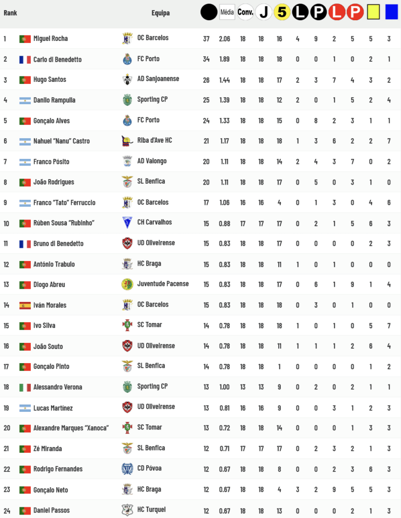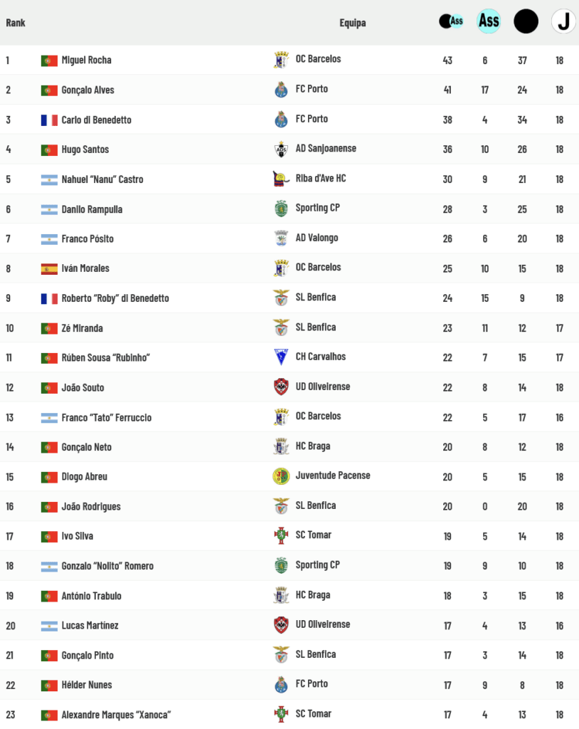 Hugo Santos, Gonçalo Alves, “Nanu” Castro e João Rodrigues marcaram 3 golos cada nos seus jogos desta jornada mas Miguel Rocha (não marcou) e Carlo Di Benedetto (marcou 1 golo ao Pacense) continuam a liderar a tabela dos Goleadores com uma lista de perseguidores de grande nível: Hugo Santos (3º com 26 golos marcados), Danilo Rampulla (4º com 25), Gonçalo Alves (5º com 24), “Nanu” Castro (6º com 21), Franco Pósito e João Rodrigues (7ºs com 20 golos marcados). Conheça a lista completa seguindo a ligação apensa à tabela abaixo.