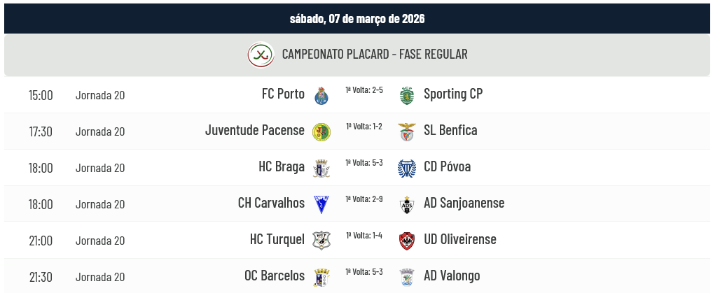 No próximo sábado disputa-se a 20ª Jornada com um jogo enorme (Porto-Sporting) e outros de muito interesse e expetativa: a visita do Benfica a Paços de Ferreira, a visita da Sanjoanense aos Carvalhos e a visita da Oliveirense a Turquel, para além das deslocações do Valongo a Barcelos e a visita do Desp. Póvoa a Braga. É o seguinte, o agendamento para a 20ª Jornada: