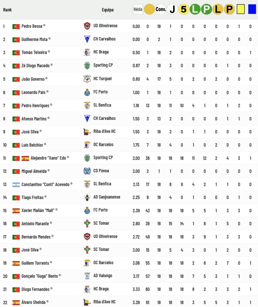 Vejamos abaixo, agora, a lista dos Guarda-Redes menos batidos, sendo que Pedro Bessa e Guilherme Mota ainda não sofreram golos mas só participaram num único jogo. Pedro Henriques, “Xano” Edo, “Xavi” Malián, António Marante e Bernardo Mendes são os primeiros da lista com mais de 10 participações efetivas em jogos. Conheça a lista completa seguindo a ligação apensa à tabela abaixo: