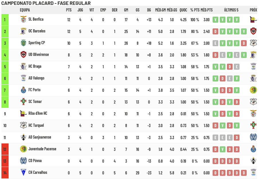 Quando faltam estes 5 jogos para terminar a 5ª Jornada, a Classificação Geral atual é a seguinte: