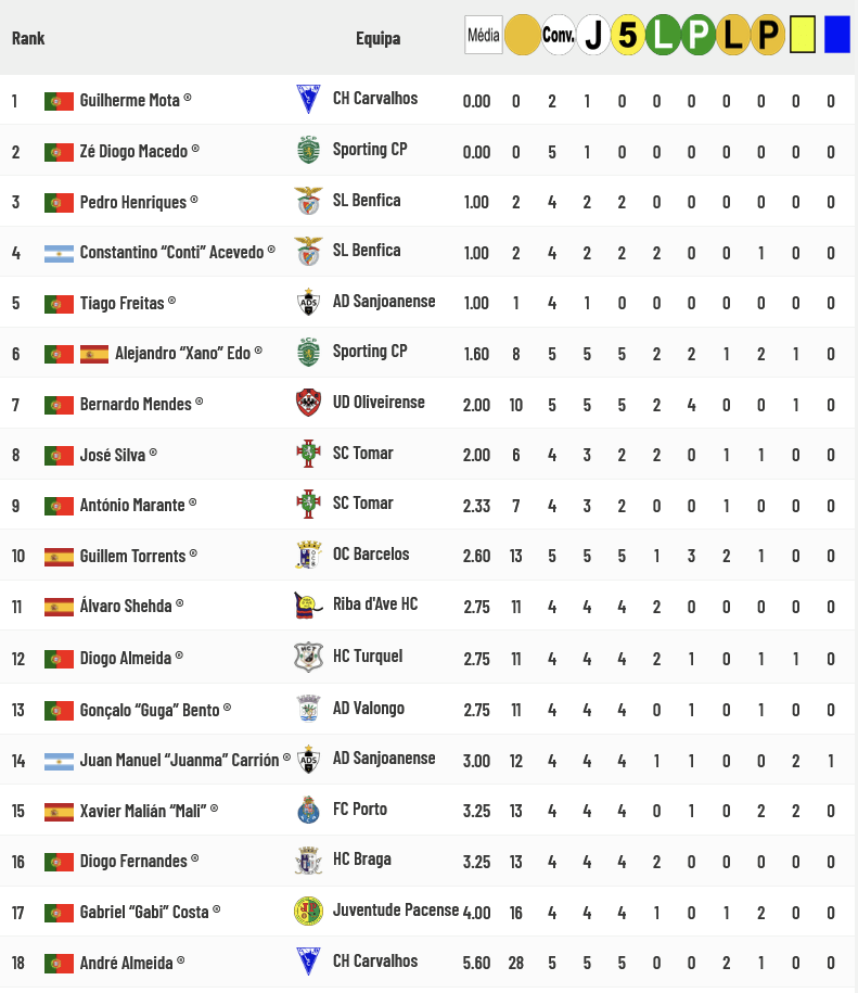 Guilherme Mota e Zé Diogo Macedo lideram a lista de Guarda-Redes mas sõ participaram ativamente em apenas 1 jogo: