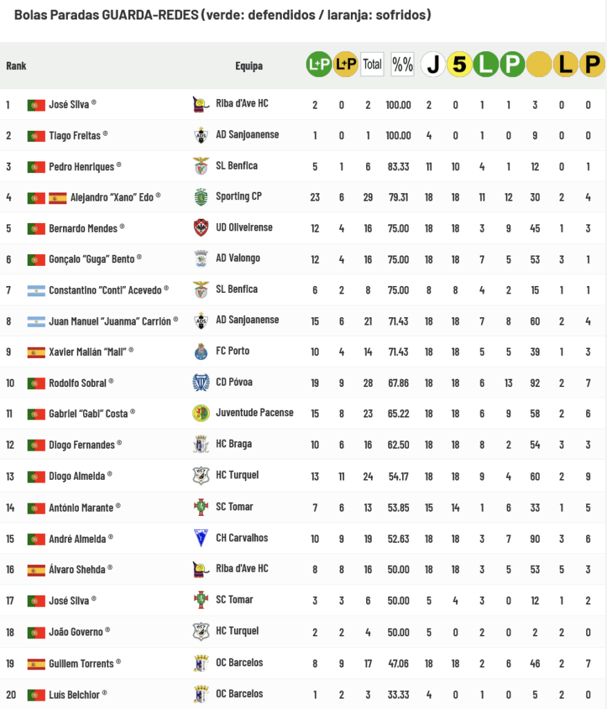 José Silva (em 2 ocasiões) e Tiago Freitas (numa somente) são os únicos guarda-redes que ainda não foram batidos nas tentativas de transformação de Grandes Penalidades ou Livres Diretos. Pedro Henriques defende mais de 80% das Bolas Paradas a que é sujeito e “Xano” Edo, Bernardo Mendes, “Guga” Bento, “Conti” Acevedo, “Juanma” Carrión e “Xavi” Malián são os guarda-redes que defendem entre 70 a 80% das tentativas de transformação a que são submetidos.