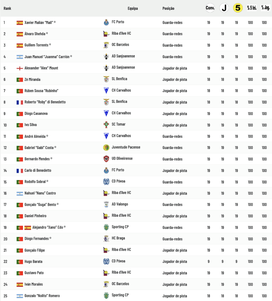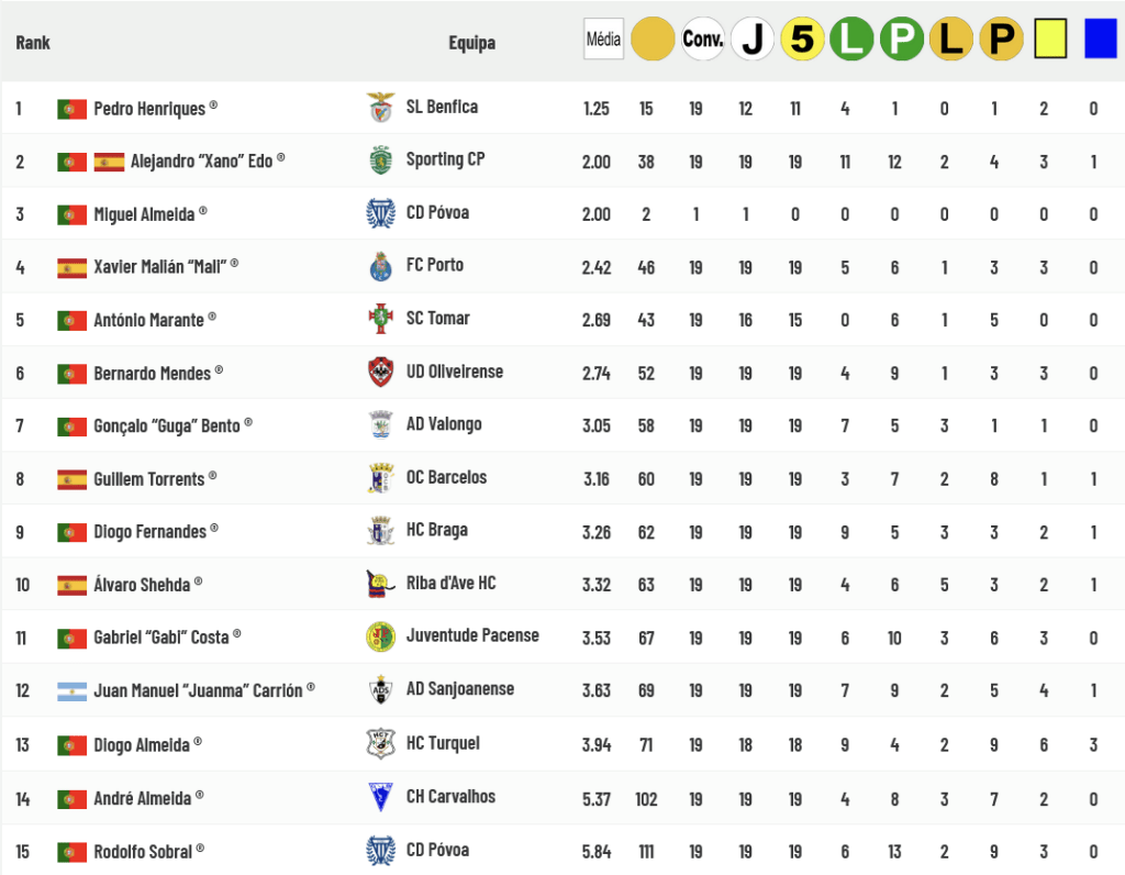 Vejamos abaixo, agora, a lista dos Guarda-Redes que participaram ativamente em, pelo menos, metade dos jogos par que foram convocados, salientando a média fantástica de 1,25 golos sofridos por jogo de Pedro Henriques mas também os “números” de “Xano” Edo, “Xavi” Malián, António Marante e Bernardo Mendes, todos com médias inferiores a 2 golos sofridos por jogo. Conheça a lista dos guarda-redes que mais jogam seguindo a ligação apensa à tabela abaixo: