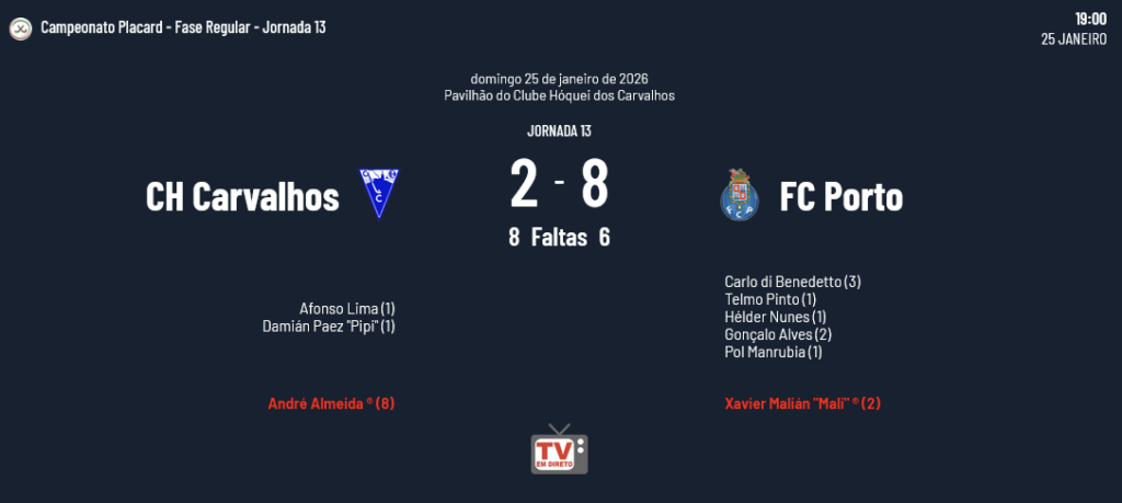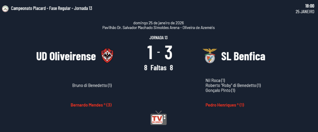 A Oliveirense teve a 3ª derrota consecutiva (Sp. Tomar 4-6, Sporting 3-4 e Benfica 1-3) e desceu para o 8º posto da tabela da Classificação Geral… O Benfica continua a liderar com 37 pontos (12 vitórias e 1 empate) seguido do Barcelos (33 pontos), Sporting (29) e Porto (28), e se bem que ainda faltam 13 jornadas, estas equipas (se mantiverem as quatro primeiras posições) terão vantagem na primeira eliminatória do Playoff. A Classificação Geral do Campeonato Placard é a seguinte: