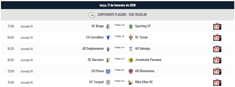 Joga-se amanhã, terça-feira dia de Carnaval, a jornada 16 do Campeonato Placard com exceção do Porto-Benfica que só se realizará na quarta-feira, 18 de fevereiro. O Braga-Sporting é o grande jogo de amanhã se atentarmos ao percurso brilhante da equipa bracarense e ao nome do adversário que ocupa a 2ª Posição da tabela classificativa. Carvalhos-Sp. Tomar, Sanjoanense-Valongo e Turquel-Riba d’Ave são jogos que poderão ter enorme influência na participação no Playoff ou até mesmo na fuga à despromoção. Barcelos-Juventude Pacense e Desp. Póvoa-Oliveirense são esperados com a expetativa de aproximação aos lugares do topo (para o Barcelos), na tentativa de ficar inserido nos 8 primeiros lugares (para Pacense e Oliveirense) e finalmente na necessidade de fuga ao último lugar da tabela da Classificação Geral (para o Desp. Póvoa). Porto-Benfica é um clássico que terá o interesse de verificar como reage ao Porto à recente eliminação da Taça de Portugal às mãos do adversário de quarta-feira e como o Benfica poderá de novo desfeitear o seu adversário mesmo jogando na casa do Dragão de novo. Vejamos os jogos agendados para a jornada 16: