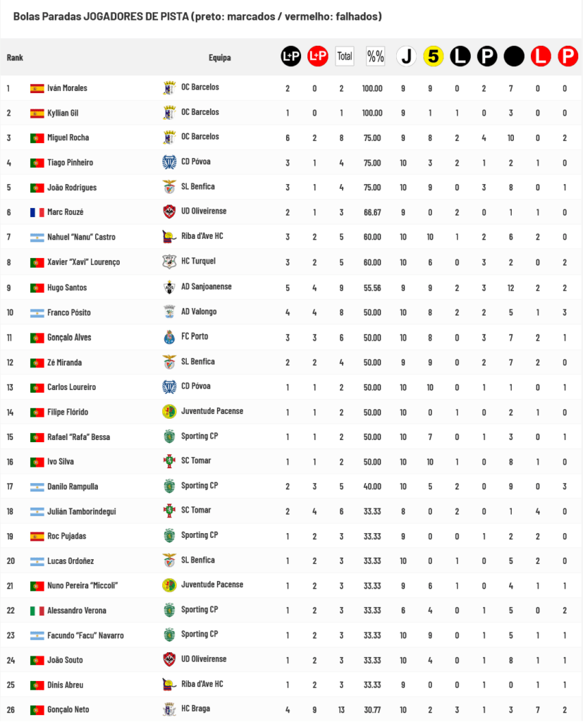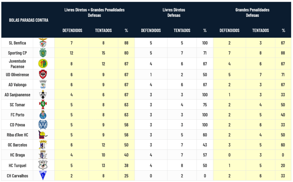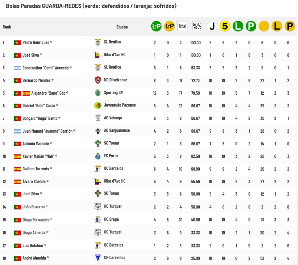São somente 3 guarda-redes que conseguem defender mais de 80% das Bolas Paradas a que são sujeitos no Campeonato Placard mas 12 no total conseguem defender mais de 50% das tentativas adversárias de transformação de Bolas Paradas:
