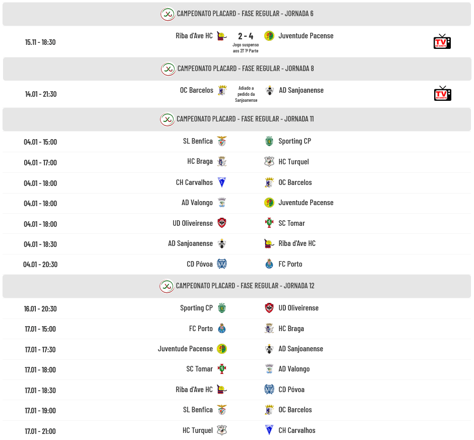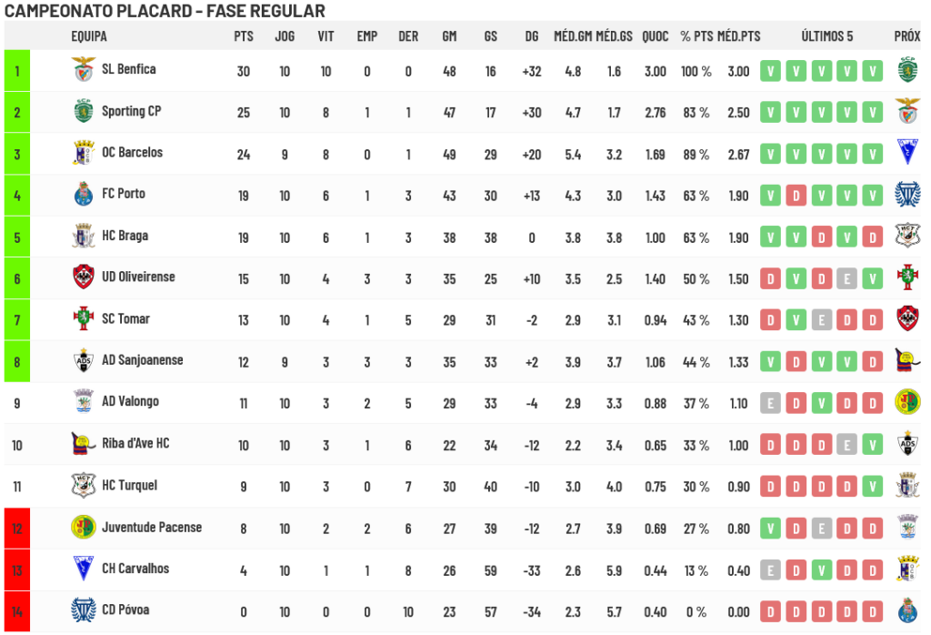 O Benfica domina o Campeonato Placard com vitórias em todos os 10 jogos disputados, enquanto Sporting (1 derrota e 1 empate) segue em 2º lugar a 5 pontos dos encarnados e o Barcelos (com menos 1 jogo) é 3º com menos 6 pontos que as “águias”. Porto e Braga vêm a seguir com menos 11 pontos que os líderes e Oliveirense, Sp. Tomar e Sanjoanense ocupam os restantes lugares de acesso ao Playoff final… Pacense, Carvalhos e Póvoa (este último ainda sem pontos conquistados) estão nos lugares de despromoção à 2ª Divisão quando faltam ainda 16 jornadas para o final desta Fase Regular, primeira fase do Campeonato Placard que que antecede o Playoff e seleciona as equipas que nele participarão.