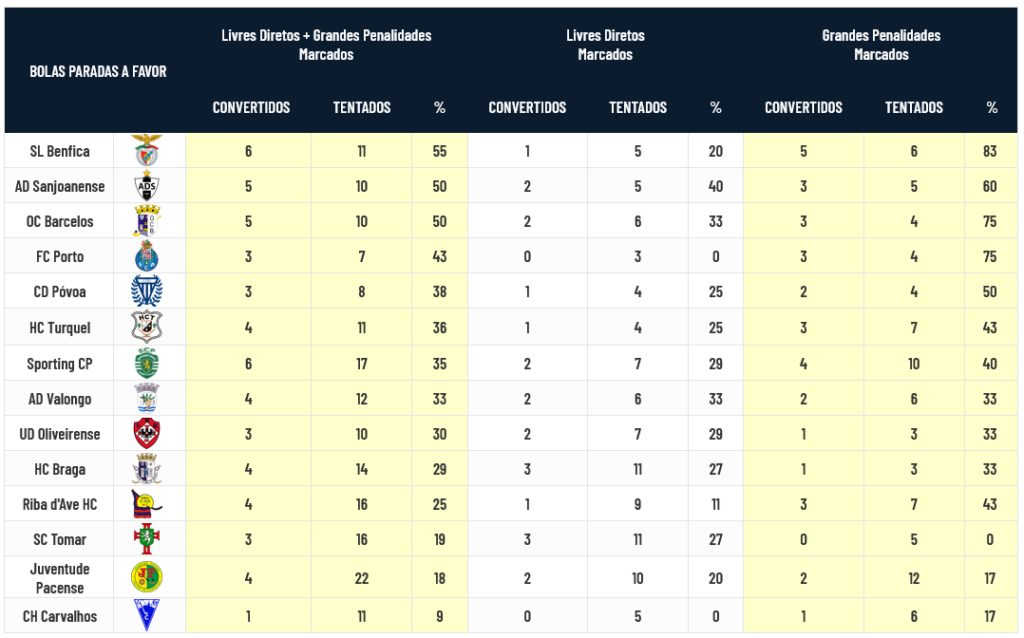 Benfica (55%), Sanjoanense e Barcelos (50%) são as únicas deste campeonato cujos jogadores têm aproveitamento igual ou superior a metade das tentativas de transformação de Bolas Paradas enquanto os jogadores do Porto conseguem um aproveitamento bastante parecido (43%). Há 7 equipas que conseguem transformar em golo entre 20 a 40% das Bolas Paradas de que foram encarregados de marcar e somente 3 equipa não o conseguem fazer mais de 20% das vezes…