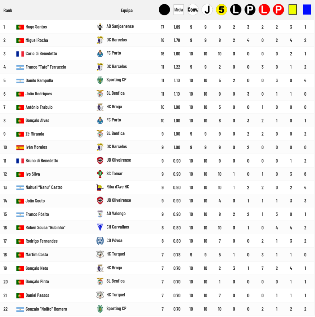 Hugo Santos (com 17 golos) é o melhor goleador do Campeonato Placard seguido de Miguel Rocha e Carlo Di Benedetto com 1 golo a menos e são estes 3 os goleadores com médias de golos marcados por jogo mais altas (1,89, 1,78 e 1,60 respetivamente)… Há ainda mais 7 goleadores que marcam habitualmente mais de 1 golo por jogo em média com “Tato” Ferruccio com 9 jogos realizados a bater a concorrência que o persegue com 1,22 golos em média por cada jogo em que participa.