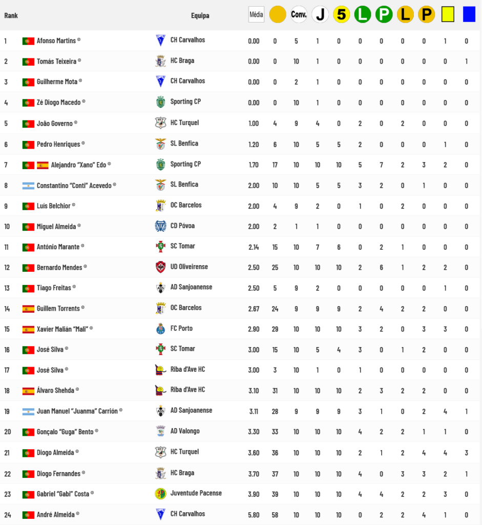 Dos guarda-redes que participaram em todos os jogos deste campeonato, Xano” Edo é o primeiro dos que fizeram todos os jogos que apresenta média inferior a 2 golos sofridos por cada jogo realizado e há 4 guarda-redes que ainda não sofreram golos mas que somente participaram em 1 jogo cada. Dos 15 primeiros guarda-redes desta lista, “Xano” Edo, Bernardo Mendes e “Xavi” Malián são os únicos que participaram e fizeram parte do 5 inicial em todos os jogos do campeonato mas Álvaro Shehda, “Guga” Bento, Diogo Almeida, Diogo Fernandes, “Gabi” Costa e André Almeida também conseguiram o triplete (10 convocatórias, 10 jogos realizados e 10 vezes no 5 inicial)… Pedro Henriques e “Conti” Acevedo dividem os jogos do Benfica e ambos apresentam médias fabulosas (média de 1,2 e 2,0 golos sofridos por cada jogo realizado)