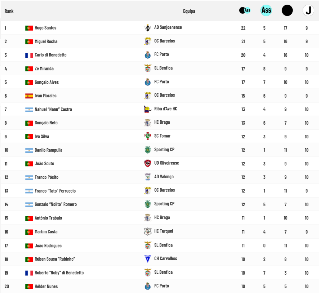 Hugo Santos (22), Miguel Rocha (21) e Carlo Di Benedetto (20) são realmente os “Pais Natal” das suas equipas com um somatório de golos e assistências igual ou superior a 20, com o Hugo a marcar 17 golos e a fazer 5 assistências para Miguel Rocha marcar 16 golos e a fazer 5 passes a facilitar o golo dos parceiros e Carlo Di Benedetto a marcar o mesmo número de golos que Miguel Rocha mas a fazer 4 assistências. Zé Miranda e Gonçalo Alves estão a seguir na lista com 17 participações em golo, 9 golos e 8 assistências para o jogador do Benfica e 10 golos e 7 assistências para o jogador do Porto… Zé Miranda é o Rei das Assistências com 7 passes para golo…