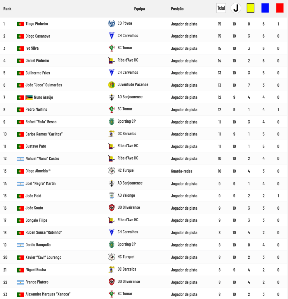 No que concerne à admoestação de Cartões e definindo uma base de 3 pontos negativos por cada cartão vermelho, 2 pontos negativos por cada cartão Azul e 1 ponto negativo por cada cartão amarelo, verificamos que Tiago Pinheiro, Diogo Casanova e Ivo Silva são os jogadores que recebem mais atenção das equipas de arbitragem com 15 pontos negativos no total: