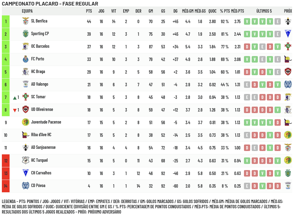 Campeonato Placard: Barcelos e Oliveirense perdem… Benfica continua líder…