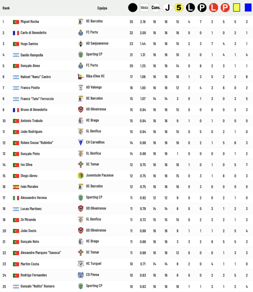 Miguel Rocha continua líder da lista de goleadores do Campeonato Placard seguido de Carlo Di Benedetto, Hugo Santos, Danilo Rampulla e Gonçalo Alves: