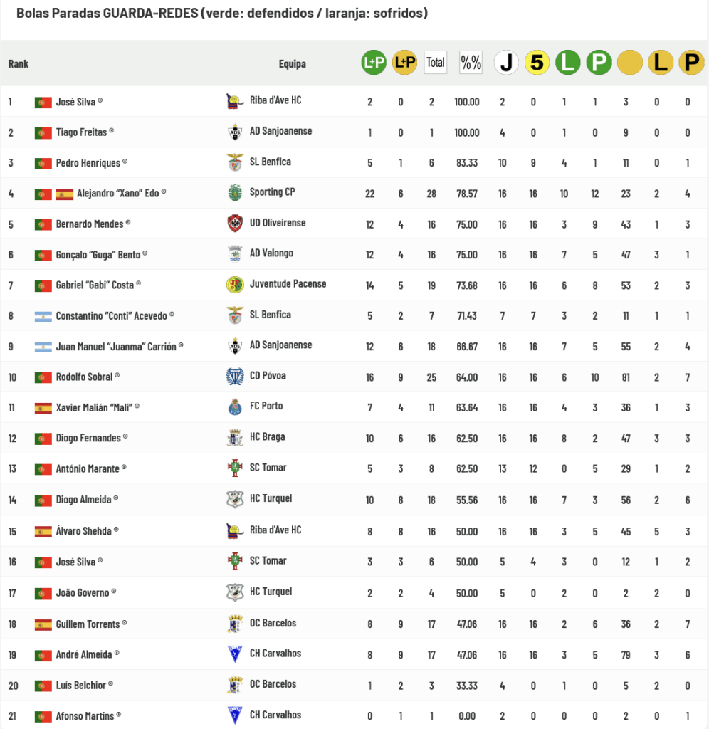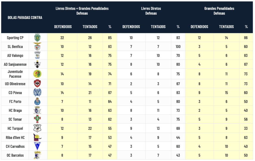 O Sporting é a equipa cujos guarda-redes apresentam melhor desempenho na defesa de Bolas Paradas, com o Benfica logo depois, sendo estas as únicas equipas que apresentam percentagens superiores a 80% de defesas.