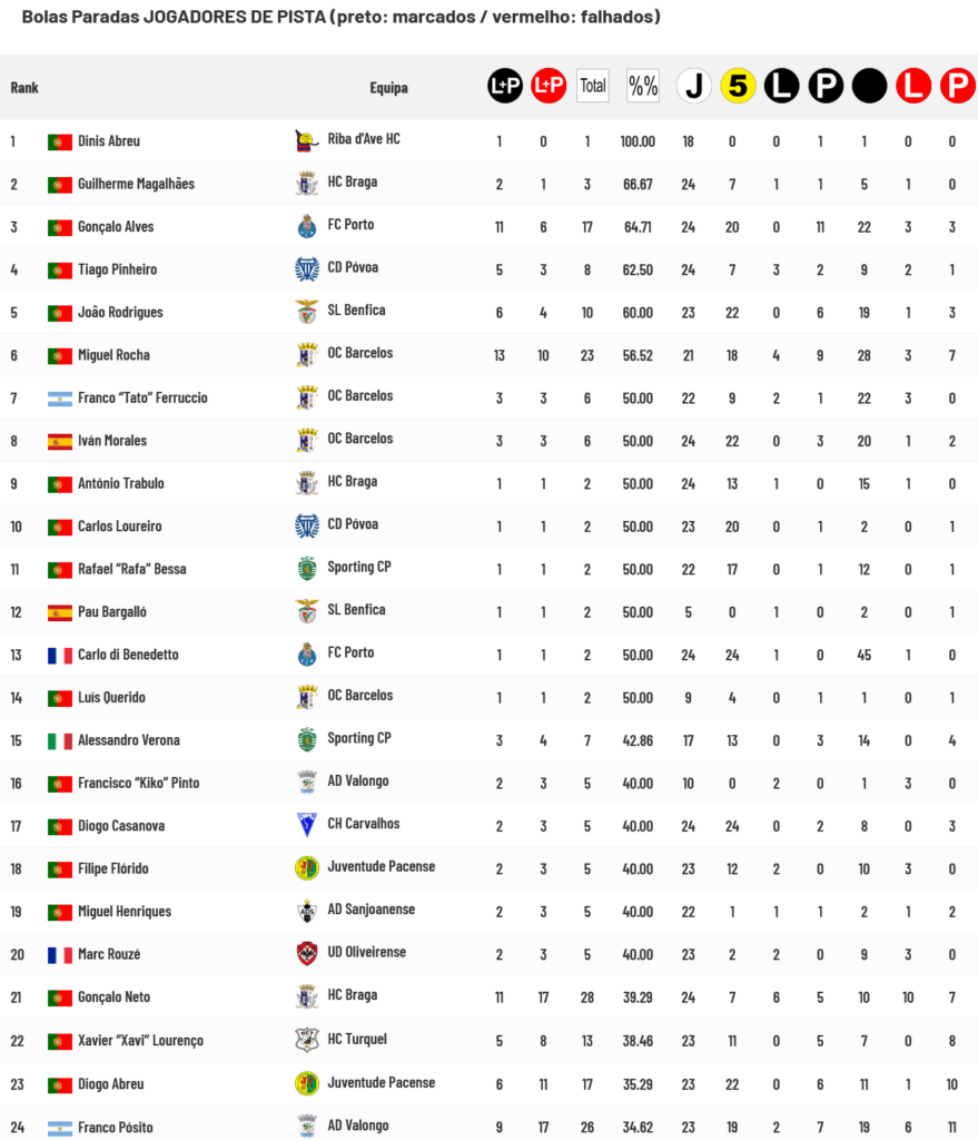 Há somente 1 jogador que nunca falhou qualquer bola parada: Dinis Abreu (só com uma tentativa)