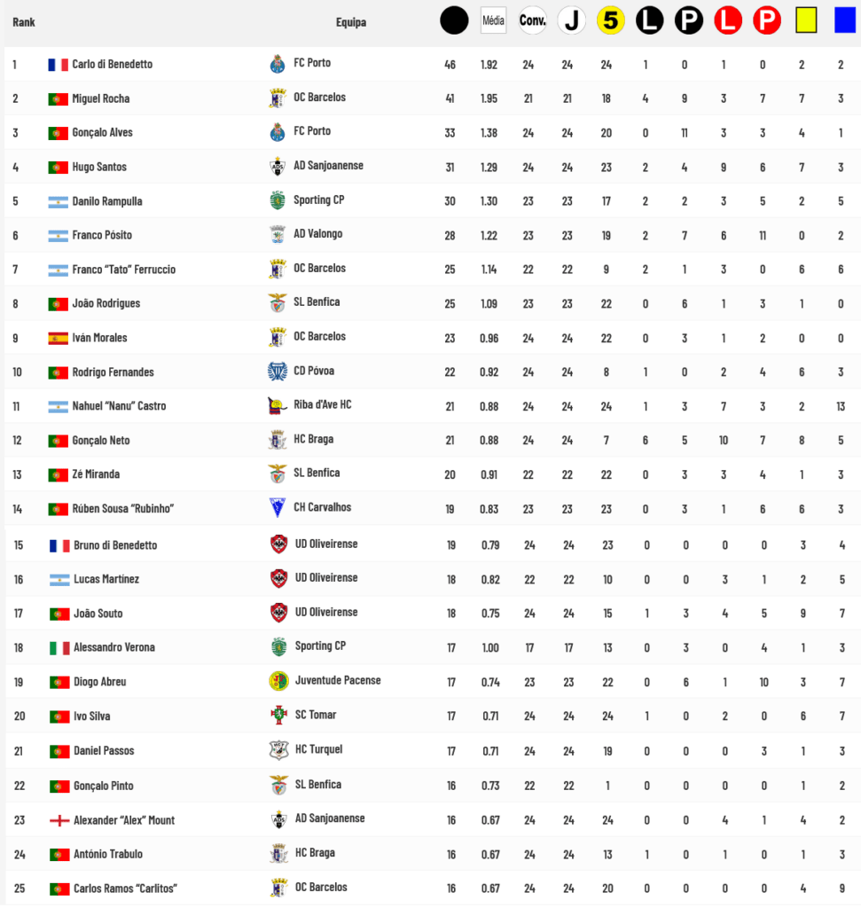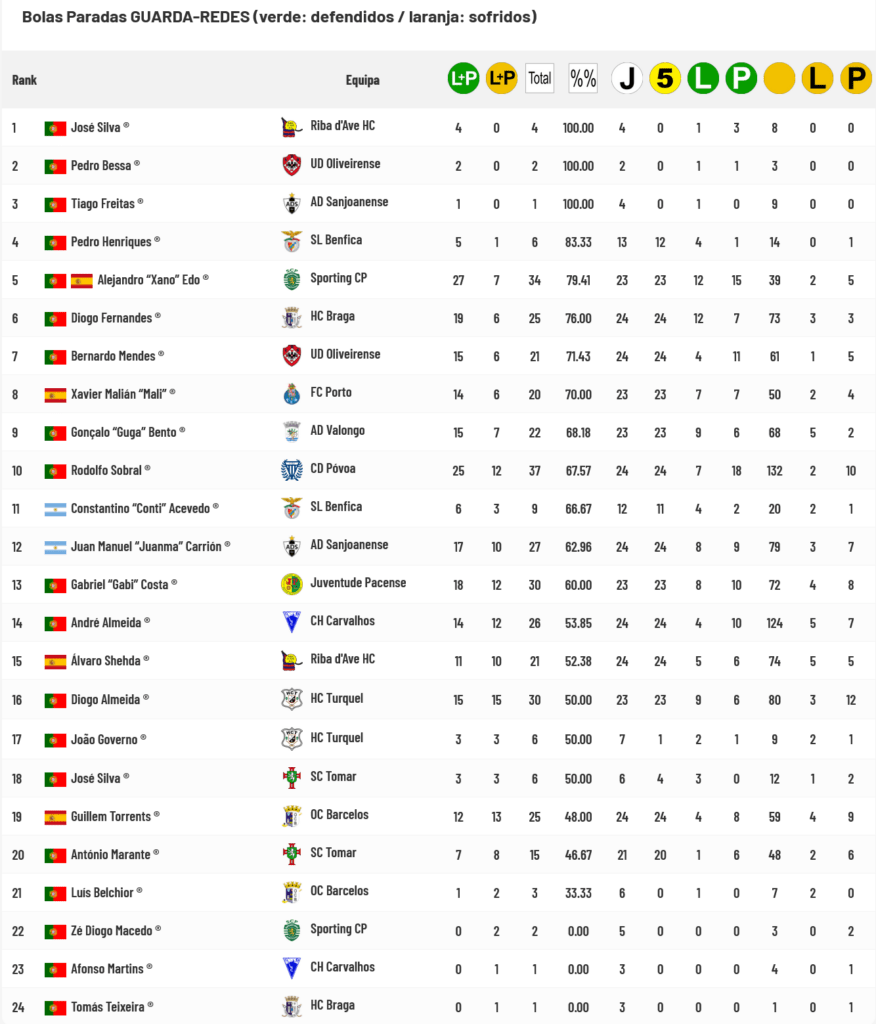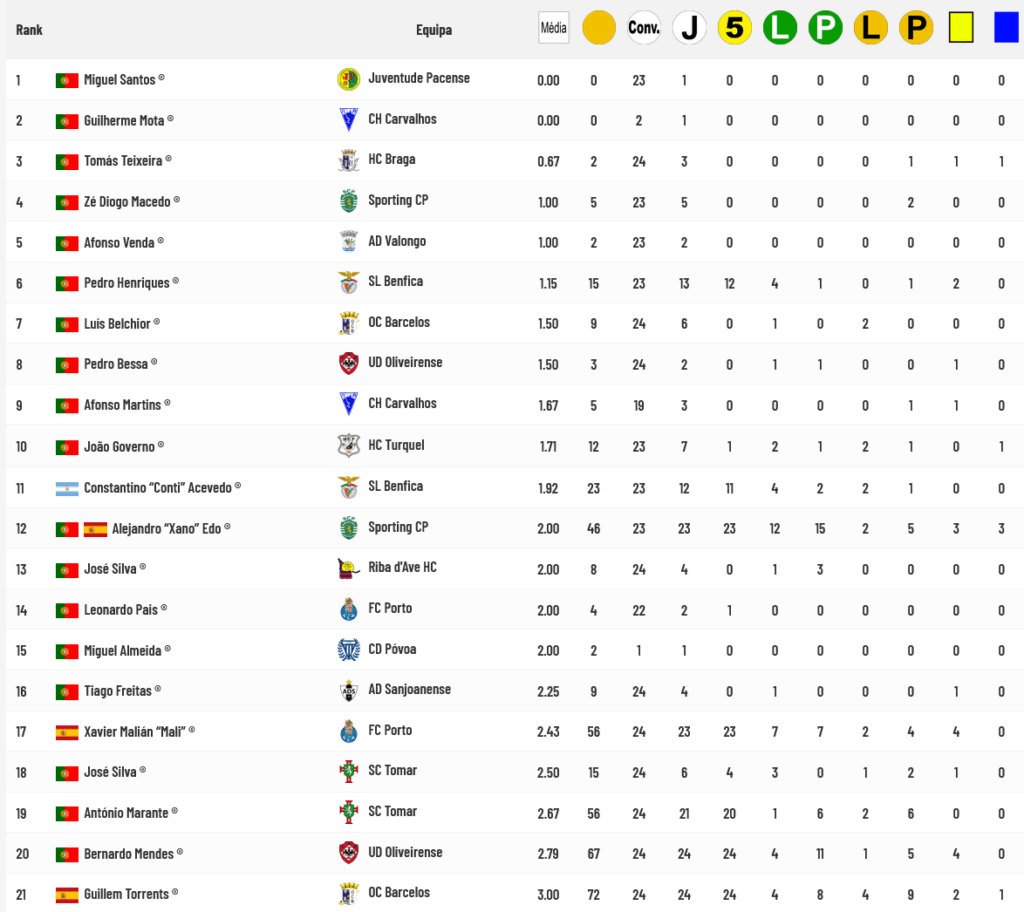 Miguel Santos e Guilherme Mota (contam apenas com 1 golo realizado) continuam a ser os guarda-redes que ainda não sofreram golos: