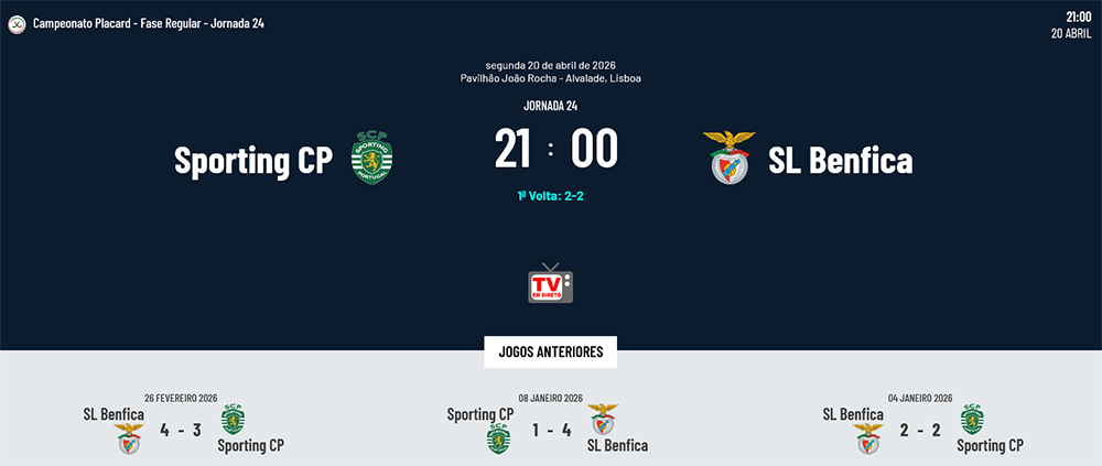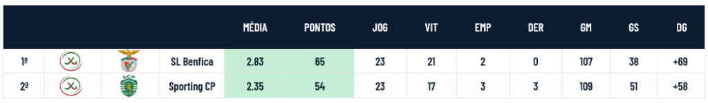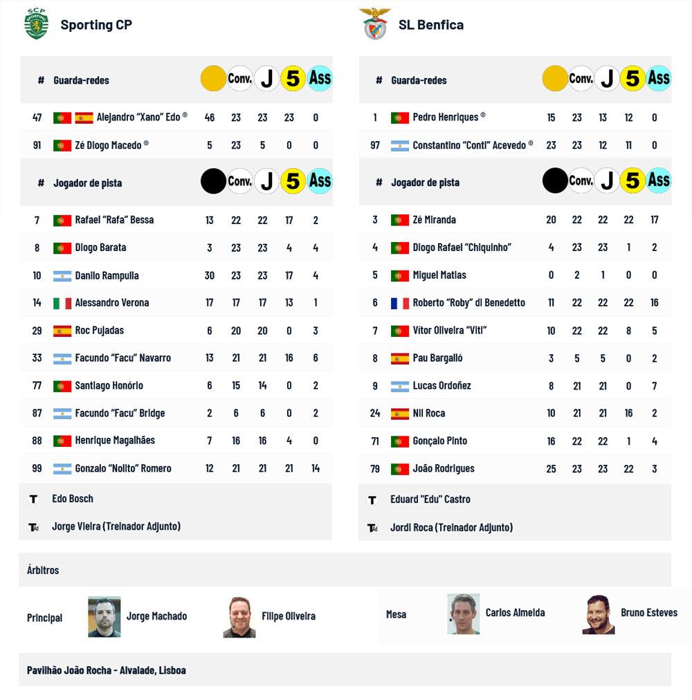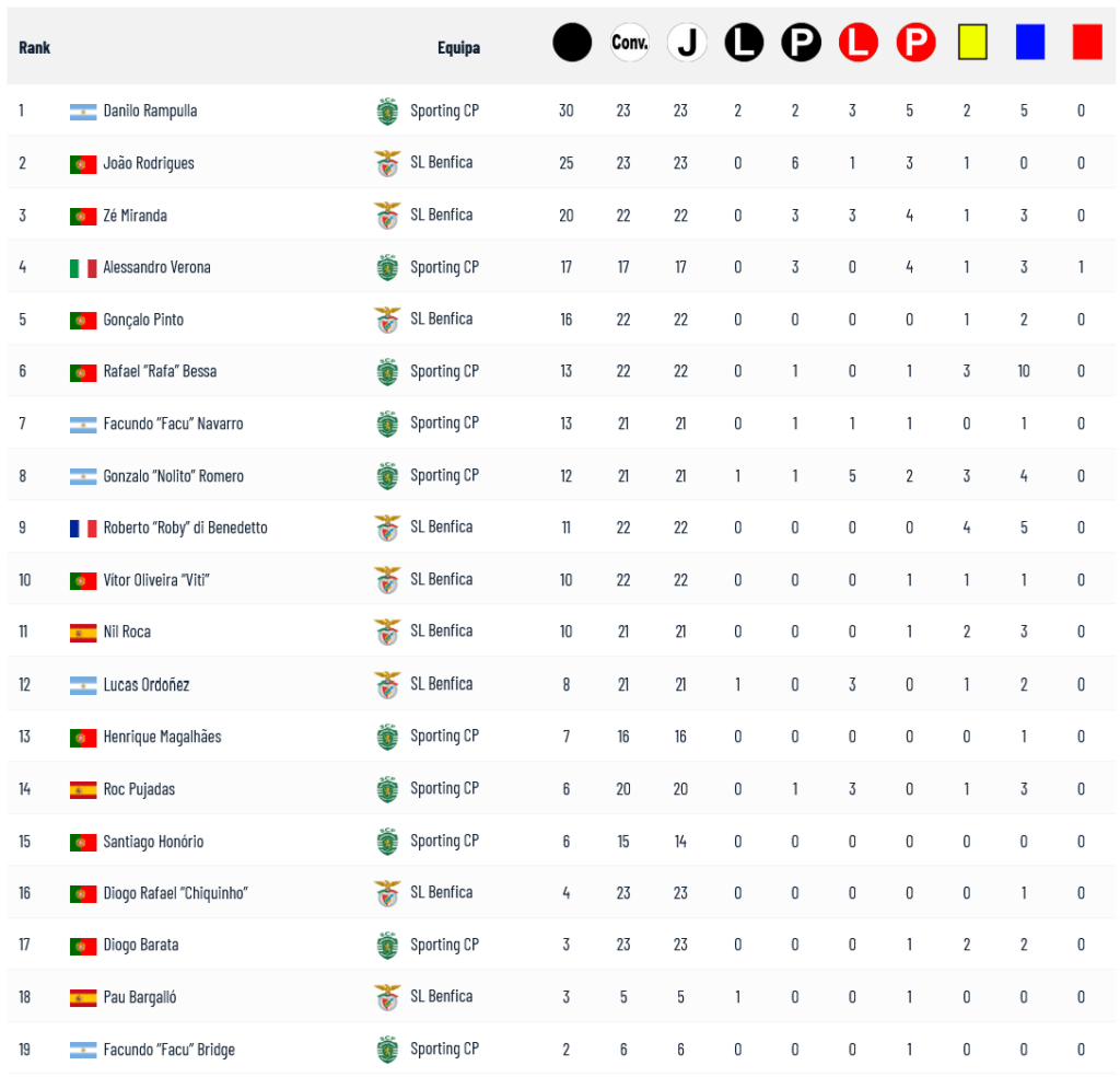 Joga-se hoje pelas 21 horas o Sporting-Benfica a contar para a jornada 24 do Campeonato Placard. O Benfica chega a esta fase da época em vantagem na tabela da classificação geral (1º com 21 vitórias e 2 empates em 23 jogos realizados) enquanto o Sporting é 3º com menos 11 pontos que os “águias” (17 vitórias, 3 empates e 3 derrotas), a 3 pontos do segundo classificado, o Porto, com 57 pontos mas 1 jogo a mais). Os intervenientes diretos estarão entre os abaixo listados: