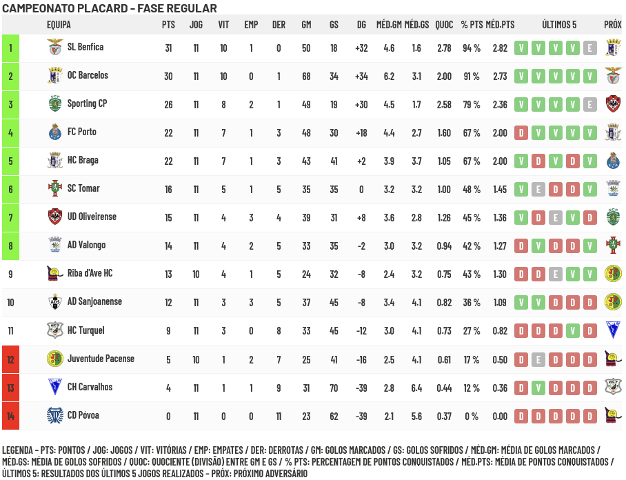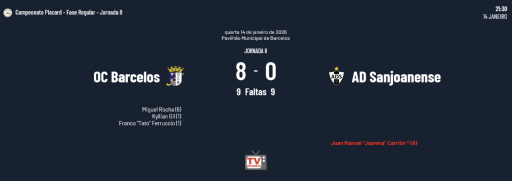Regressa hoje de novo o Campeonato Placard após a vitória na quarta-feira passada do Barcelos sobre a Sanjoanense que concluiu a jornada 8 e que tinha ficado adiado (devido ao falecimento de um membro do staff sanjoanense) e que viu Miguel Rocha marcar 6 golos numa partida (pela segunda vez neste campeonato!!).