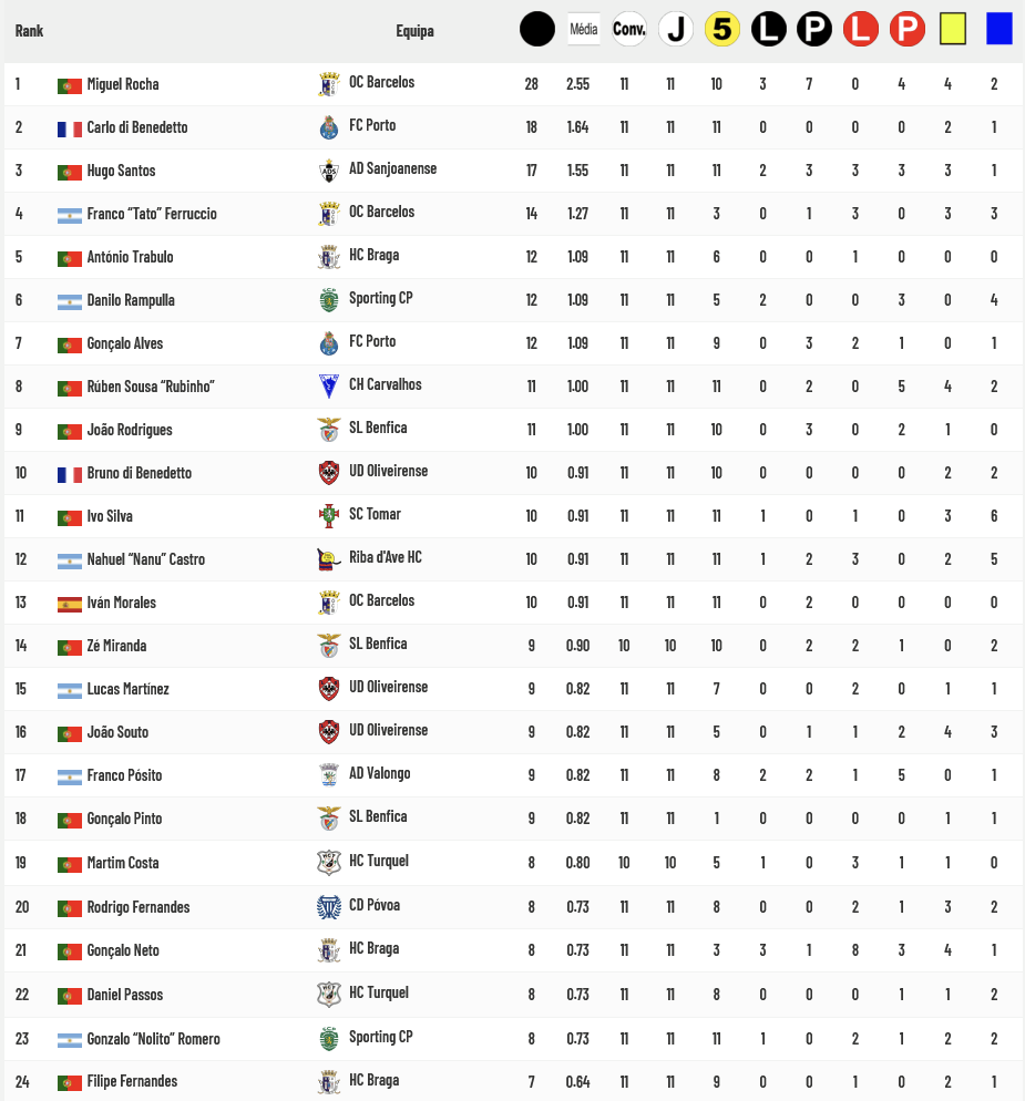 Miguel Rocha continua a ser o jogador que mais contribui para a marcação de golos, sejam marcados por ele próprio (28) ou fazendo o passe decisivo para golo (5). Hugo Santos, Carlo Di Benedetto e Gonçalo Alves estão logo a seguir na lista com 23, 22 e 21 participações em golos, respetivamente.