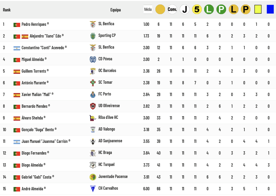 Se considerarmos somente os Guarda-Redes que já participaram ativamente em mais de metade dos jogos para os quais foram convocados no Campeonato Placard, temos que somente Pedro Henriques e “Xano” Edo apresentam valores inferiores a 2 golos sofridos em média por cada jogo realizado: