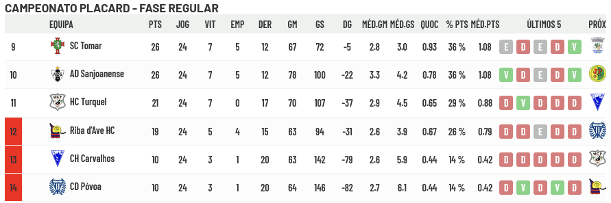 Como se depreende pelo quadro abaixo extraído da tabela da Classificação Geral, CH Carvalhos e CD Póvoa já estão despromovidos à 2ª Divisão Nacional enquanto o Riba d’Ave HC se encontra ainda em posição de despromoção a 2 pontos do HC Turquel que, por sua vez, ainda pode atingir os 27 pontos e, se tal acontecer, ultrapassar SC Tomar e AD Sanjoanense na tabela classificativa se, obviamente, estes não pontuarem nas duas jornadas que restam disputar. Ao SC Tomar bastará conquistar 1 ponto resultante de um empate para conseguir a manutenção em virtude da vantagem no confronto direto com o HC Turquel (6-4 e 3-4) mas a AD Sanjoanense necessita de 2 pontos ainda (2 empates ou até mesmo 1 vitória) face à desvantagem no confronto direto com o mesmo HC Turquel (5-3 e 1-6), contas que poderão nem ter qualquer significado se o HC Turquel perder um (ou ambos) dos dois jogos que ainda tem de realizar (em Carvalhos e na receção ao Barcelos).