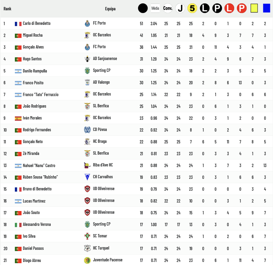 Carlo Di Benedetto tem uma vantagem de 10 golos marcados sobre Miguel Rocha, 15 sobre Gonçalo Alves e 20 sobre Hugo Santos: