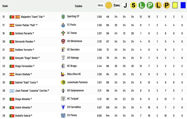 Miguel Santos e Guilherme Mota podem ainda não ter sofrido qualquer golo (disputaram somente 1 jogo) mas os números de Pedro Henriques são fabulosos: média de 1,21 golos sofridos nos 14 jogos já disputados!!! “Conti” Acevedo (11 jogos e média de 1,92 golos sofridos por jogo) apresenta também valores muito bons mas “Xano” Edo é o que apresenta melhor média de golos sofridos (2 por jogo) se considerarmos o conjunto dos guarda-redes que disputaram todos os jogos deste Campeonato Placard. Abaixo apresento a lista dos Guarda-Redes que sofrem (em média) menos de 3 golos em cada jogo,