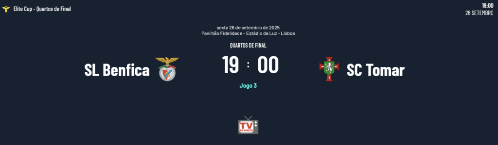 O terceiro jogo dos Quartos de Final coloca frente a frente o Benfica (Campeão da Fase Regular do Campeonato Placard da época passada) e o Sp. Tomar (8º classificado do Campeonato Placard da época passada):