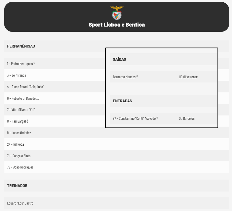 O Benfica, a par com o Porto, manteve uma equipa bastante estável alterando somente um jogador, a troca do Gurda-Redes Bernardo Mendes (foi para a Oliveirense) por “Conti” Acevedo (do Barcelos). Ao contrário do seu rival “dragão”, o Benfica mantém Edu Castro como treinador.