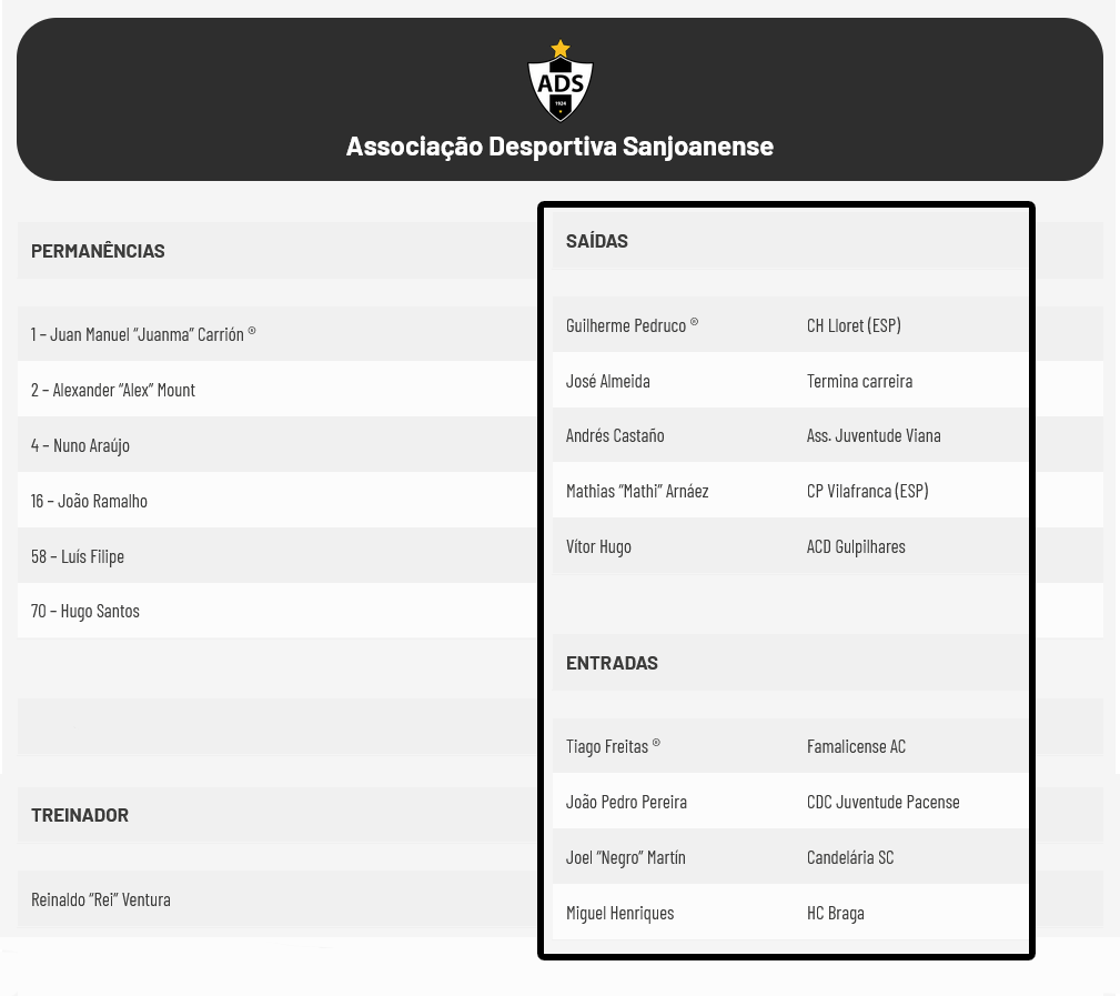 Para além de José Almeida (termina carreira), “Rei” Ventura perdeu o concurso de 4 importantes jogadores: Guilherme Pedruco (guarda-redes que vai para o Lloret), “Mathi” Arnáez (para o Vilafranca de Espanha), Vítor Hugo (para o Gulpilhares) e Andrés Castaño (para a Juv. Viana). A Sanjoanense, no entanto, recrutou 4 jovens de grande valor: Tiago Freitas (guarda-redes que vem do Famalicense), Miguel Henriqes (do Braga), João Pedro Pereira (da Juv. Pacense) e Joel “Negro” Martín (jovem argentino que veio do Candelária).