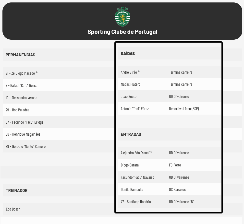 O Sporting perdeu um dos esteios (o Guarda-Redes André Girão termina a carreira desportiva) e para o seu lugar escolheu o guarda-redes titular da Seleção Nacional, “Xano” Edo (vindo da Oliveirense). Em termos dos jogadores de pista, Matías Platero (termina carreira), João Souto (para a Oliveirense) e “Toni” Pérez (para o Liceo) são baixas de peso e para o seu lugar Edo Bosch escolheu “Facu” Navarro (da Oliveirande), Danilo Rampulla (do Barcelos) e Diogo Barato (do Porto) mas não ficou por aqui, depositando a sua confiança também em Santiago Honório (da Oliveirense “B”).