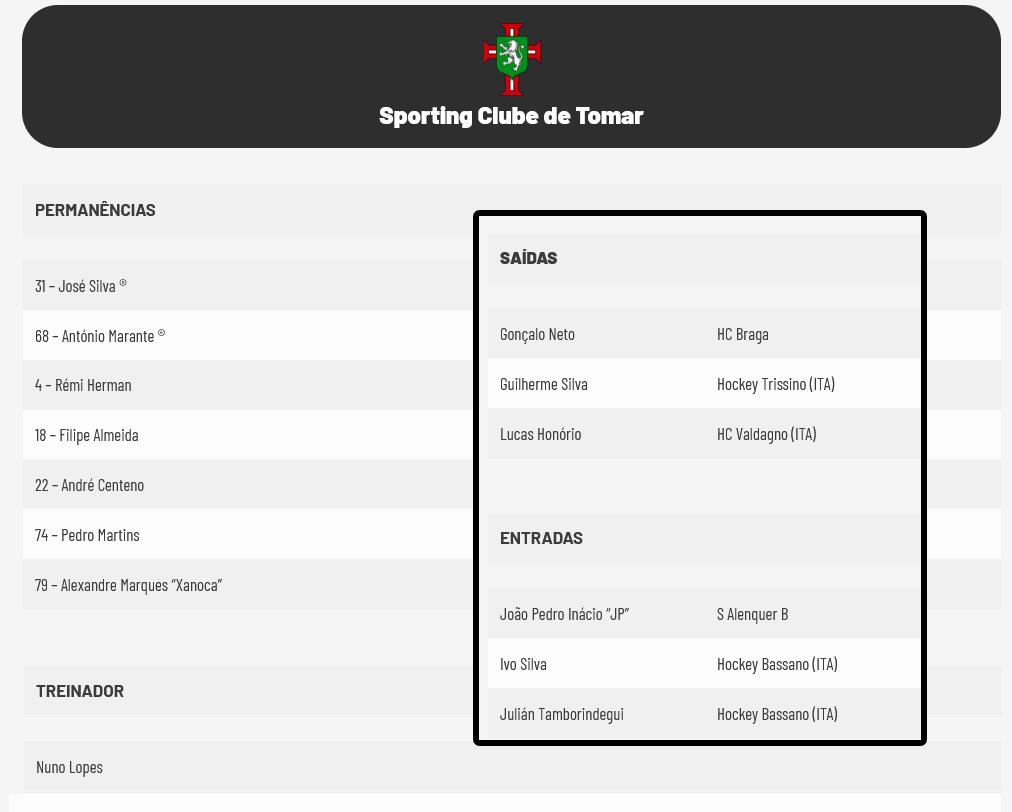 Já o Sp. Tomar manteve 7 jogadores da época passada e trocou 3, sendo todas as saídas bem mediáticas… Gonçalo Neto (para o Braga), Guilherme Silva (para o Trissino) e Lucas Honório (para o Valdagno) são baixas muito importantes e Nuno Lopes espera colmatar estas perdas com o regresso de Ivo Silva (do Bassano) que vem acompanhado do “craque” argentino Julián Tamborindegui (do Bassano) e ainda a repescagem de João Pedro Inácio “JP” ao Alenquer.