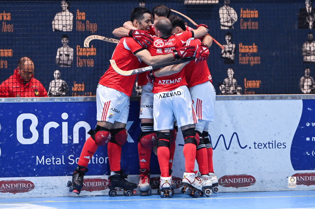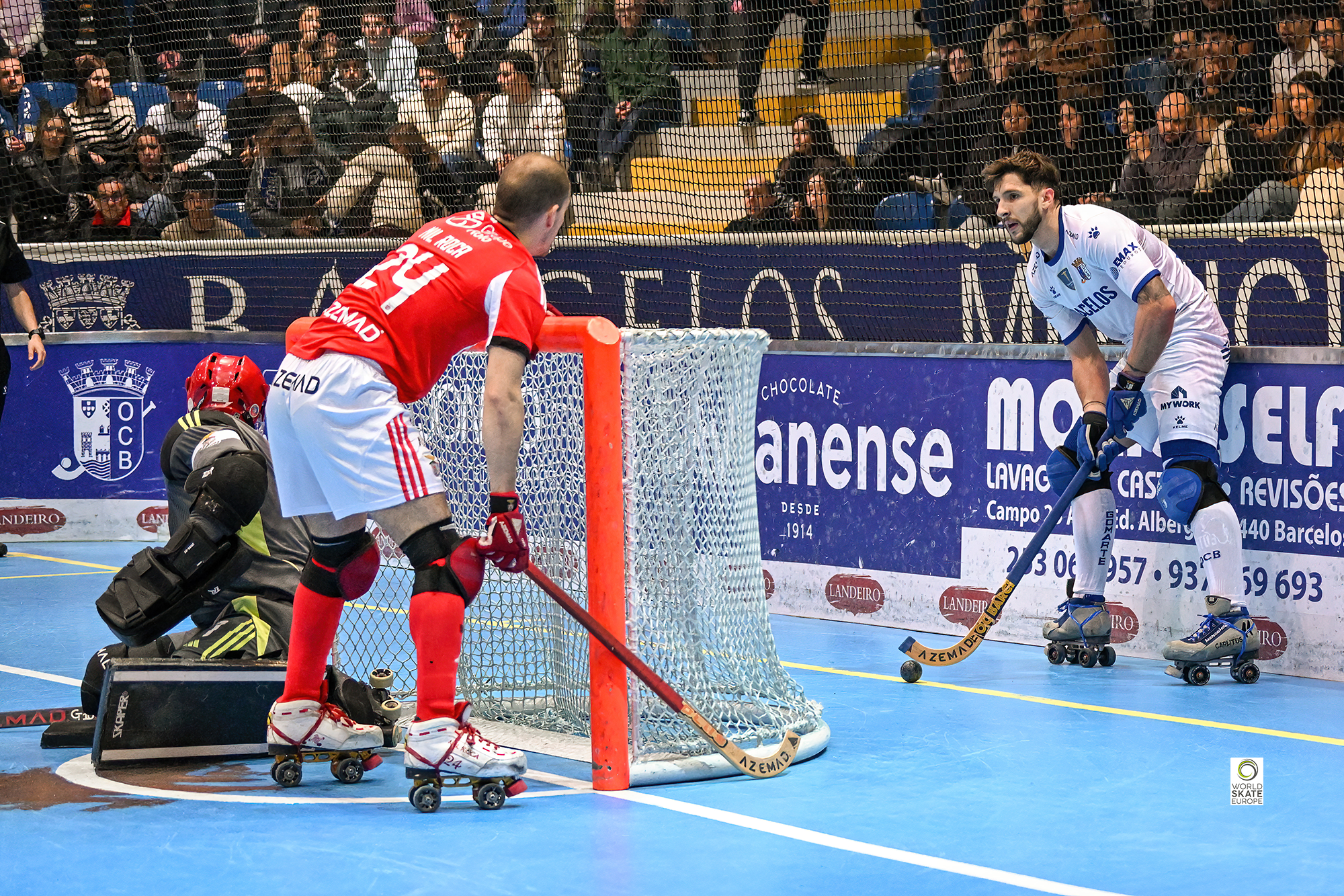 Jogada de ataque organizado do Benfica com Roberto Di Benedetto a rematar da zona central da pista com "Carlitos" Ramos a tentar receber o bola junto ao poste esquerdo da sua baliza e, sem querer, a desviá-la para dentro da baliza do Barcelos